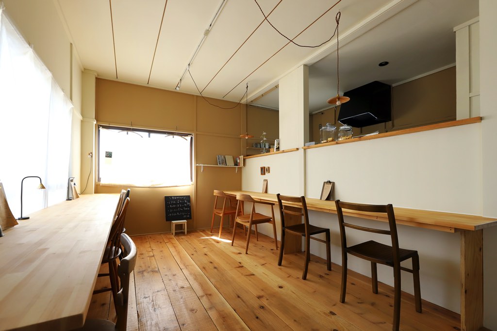 店内は土足のまま入店OKで、右手にはカウンター席8席のみのカフェスペース、左手には作家ものの器やカトラリーなどが並ぶショップスペースが広がる。