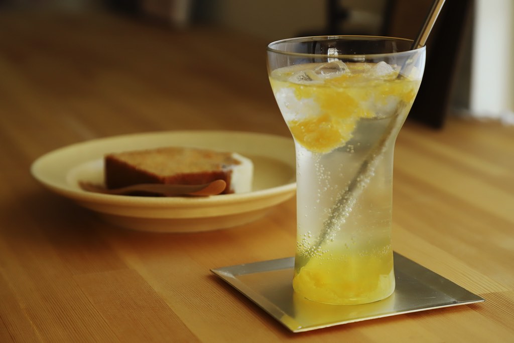自宅の畑で収穫したフルーツで作ったシロップで登場する特製ジュースは、水かソーダで割って。