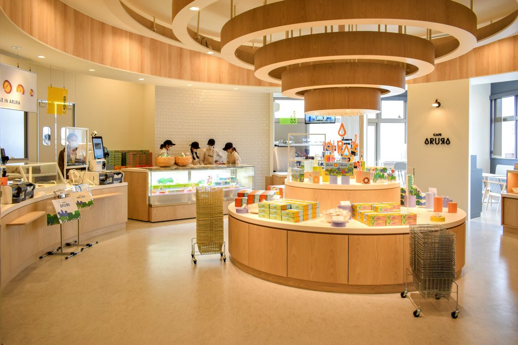 バウムクーヘンの年輪を思わせるようなオブジェライトと木目を基調とした温かみの溢れる店内には、地元の食材をたっぷり使用した絶品バウムクーヘンがズラリ!