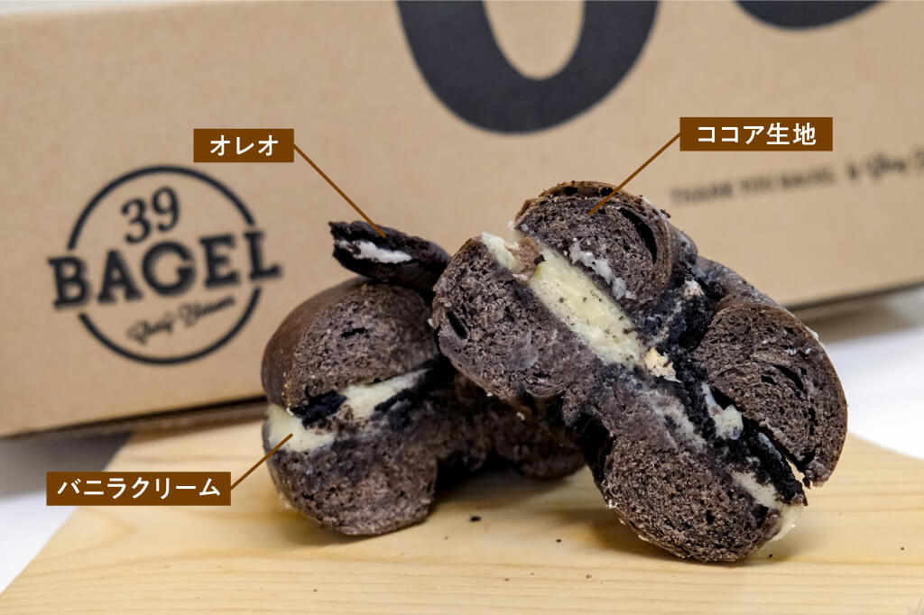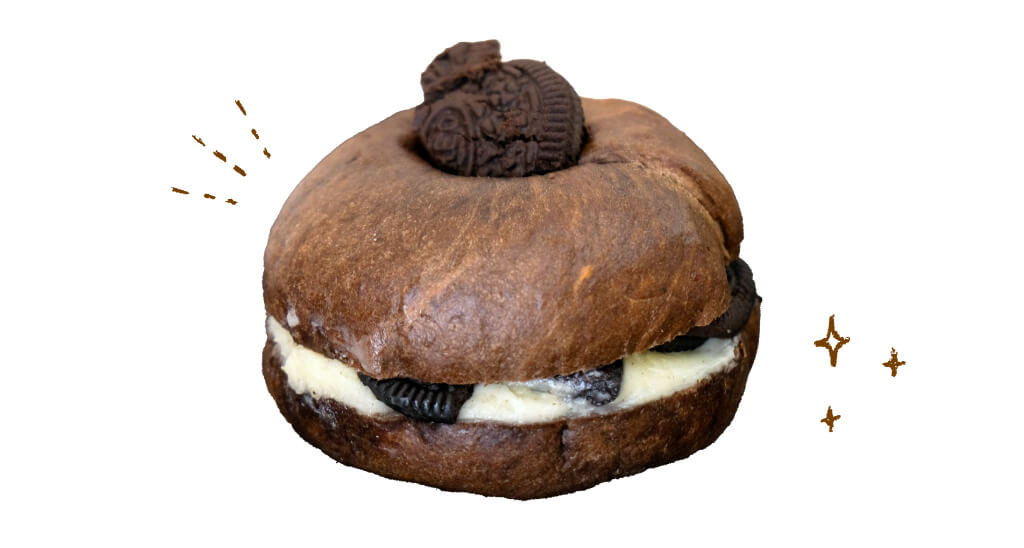 こってり甘いクリームに、オレオまでオンした欲張りココア生地のベーグル。