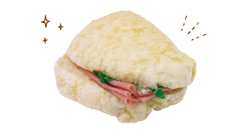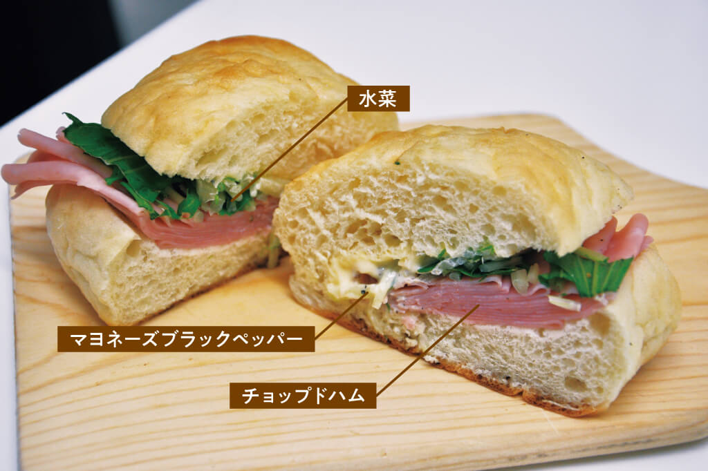 白パンの素朴な味わいと薄く折りたたんだチョップドハムの塩味がよいバランス。