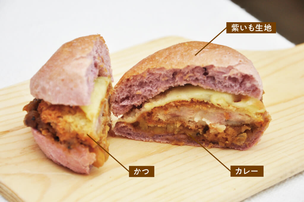 紫いもの色鮮やかなバンズとひと口サイズのロースカツ、スパイスを使った本格大豆カレー、チーズの組み合わせ。