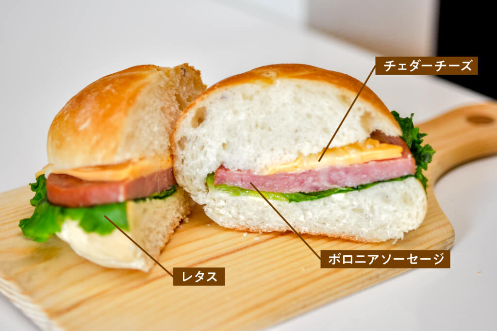 小麦の味がしっかり残るバンズに、ボロニアソーセージとチェダーチーズをサンド。
