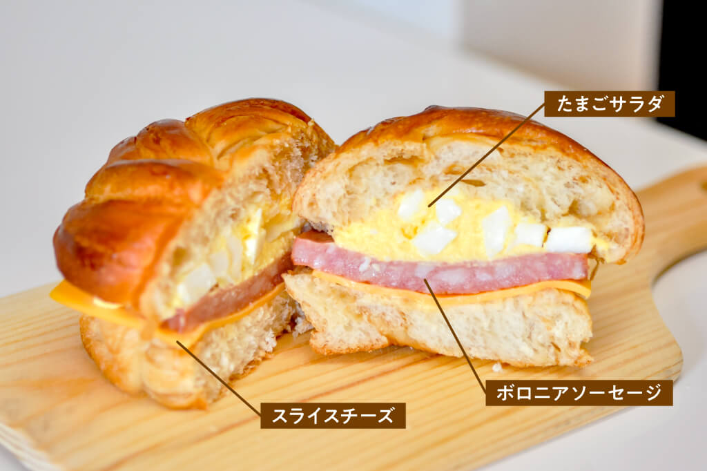 メープルのほのかな甘さを感じるふわふわスコッチ生地に、たまごサラダ、ボロニアソーセージ、スライスチーズを挟んだサンドは、期待を裏切らない美味しさ。