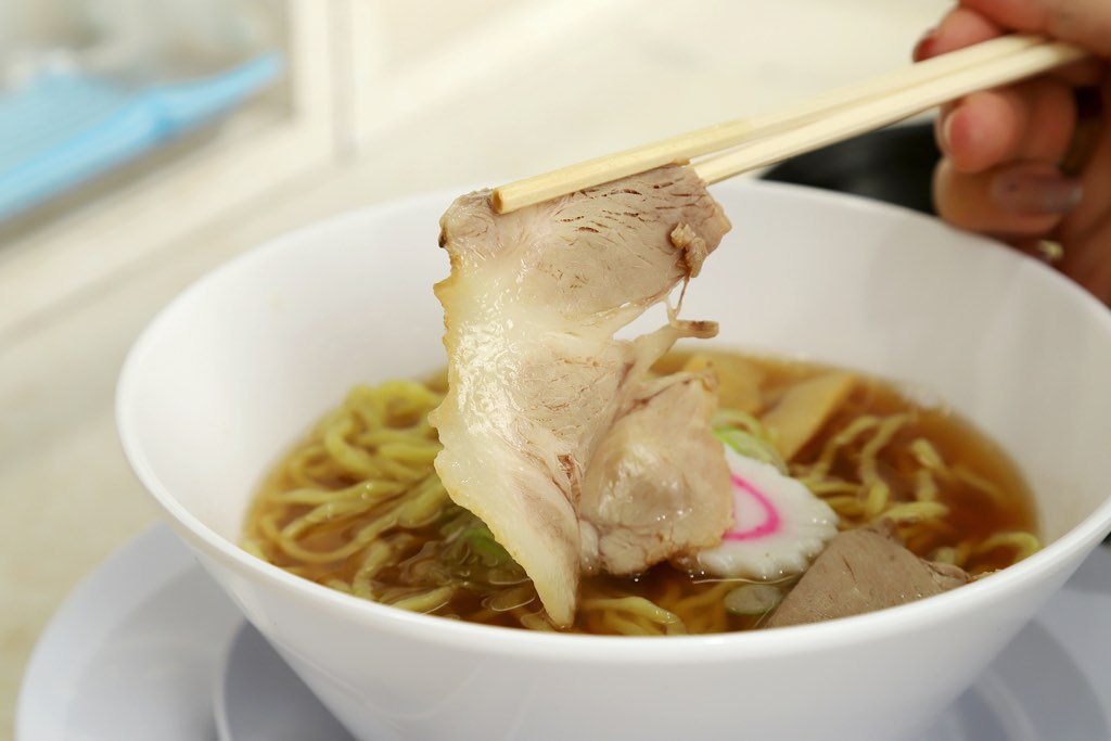 やわらか仕上げの豚肩ロースのチャーシューは、肉多め部分と脂多め部分の2枚がのり、味わいの違いを楽しめるのも、ちょっと贅沢♪