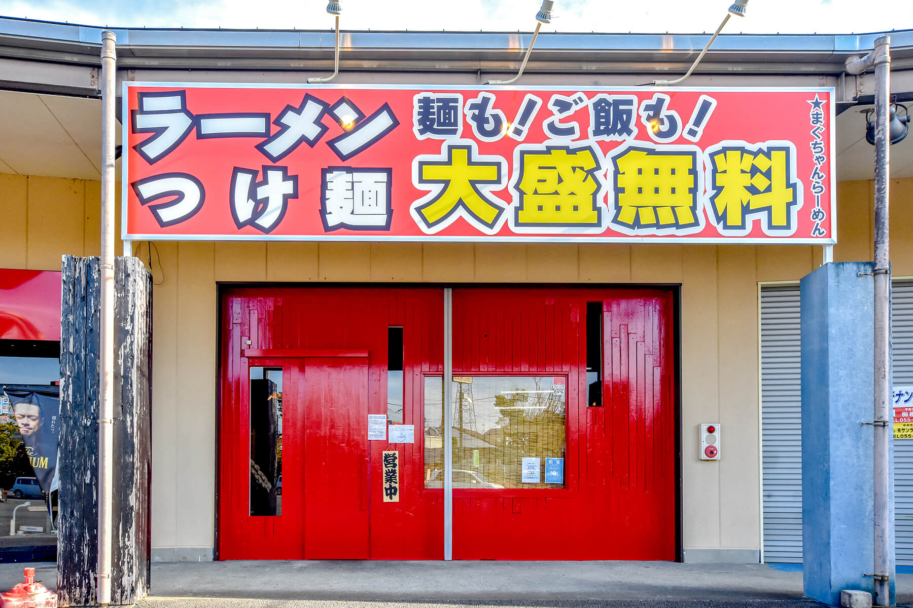 甲斐市響が丘のテナントの一角、真っ赤な外観がインパクト大の「まぐちゃんラーメン響が丘店」。