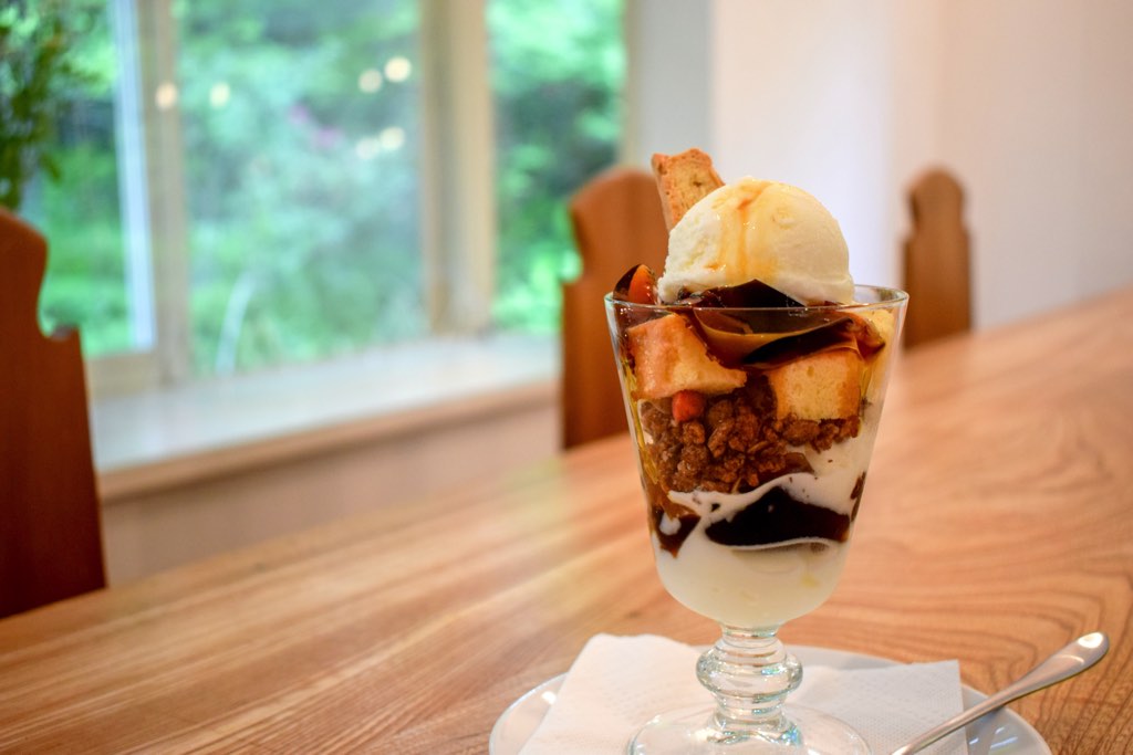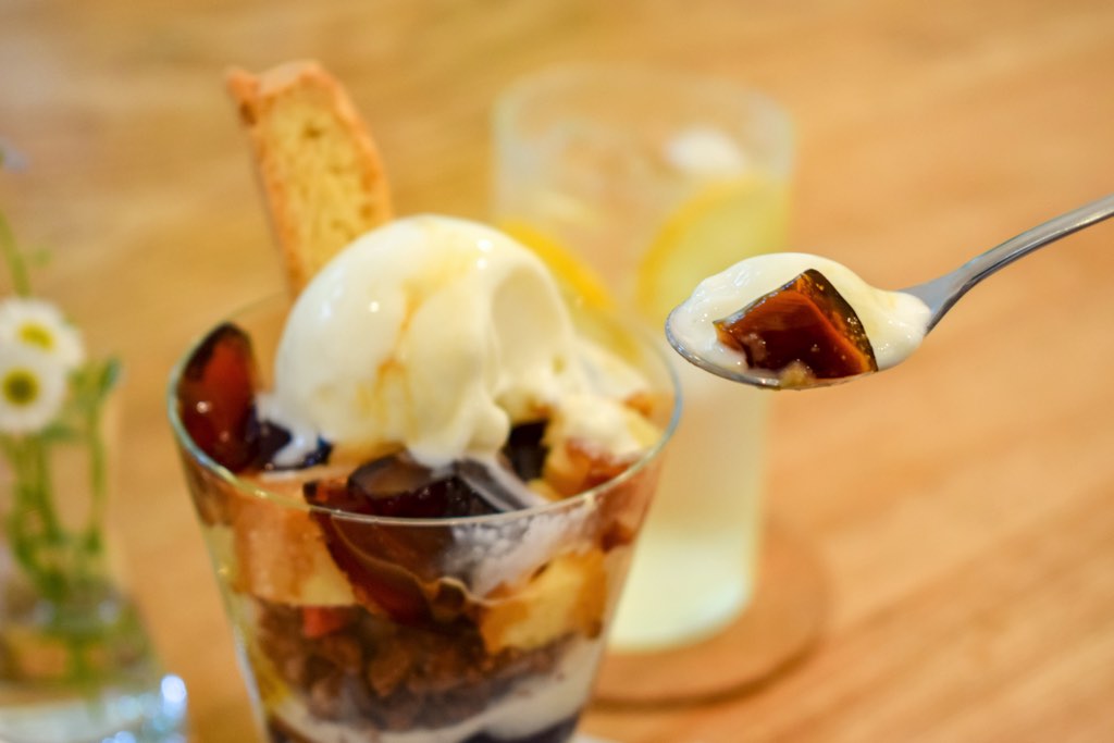 手間暇かけて創られたこだわりパフェは、ビスコッティ、スポンジケーキ、コーヒーゼリー、ミルクゼリーと、全て店主の手作り。