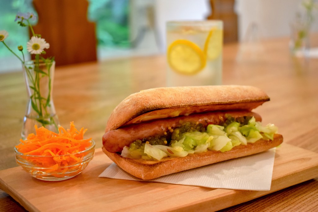 サンドウィッチは、イタリア生まれのパン「チャパタ」に、八ヶ岳産ソーセージと自家製ザワークラウトをサンドしたひと品。ほのかに香るローリエの爽快感が鼻を抜ける。