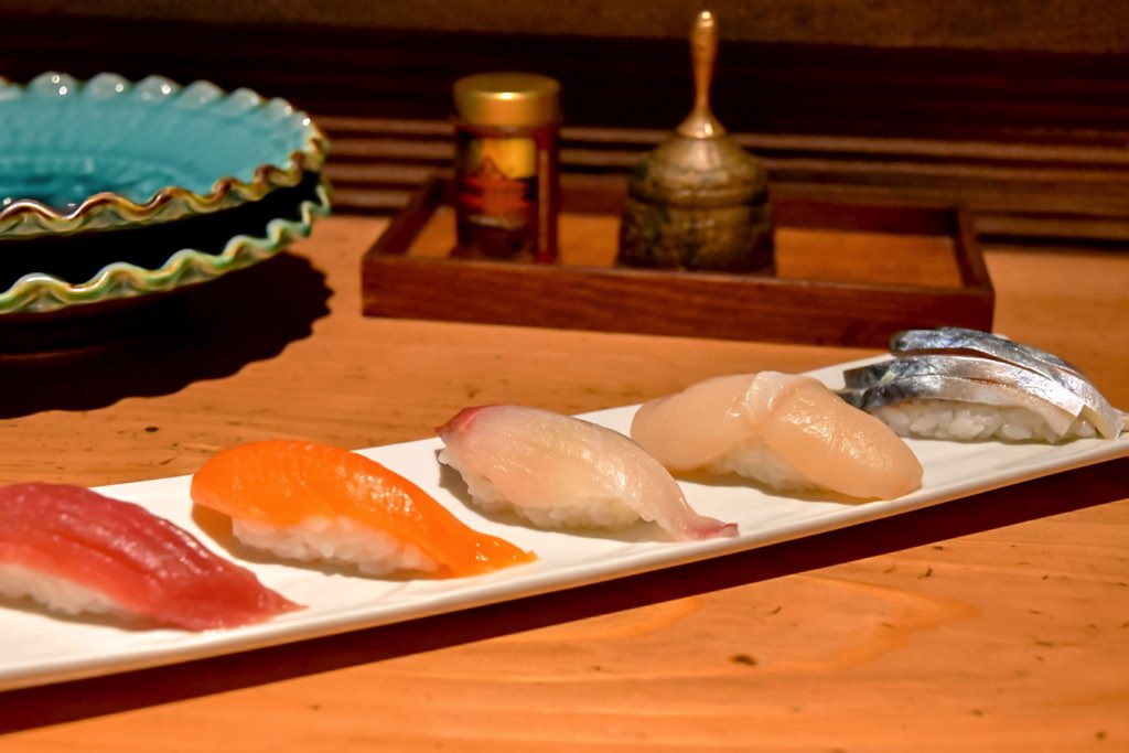 店主の目利きでその日に仕入れた新鮮な魚介類を提供するおまかせ「恩の時 特上握り寿司」。その時季に格別に旨味を増す旬の魚が味わえると人気のひと皿だ。