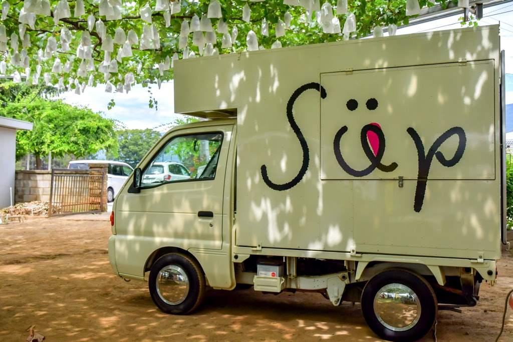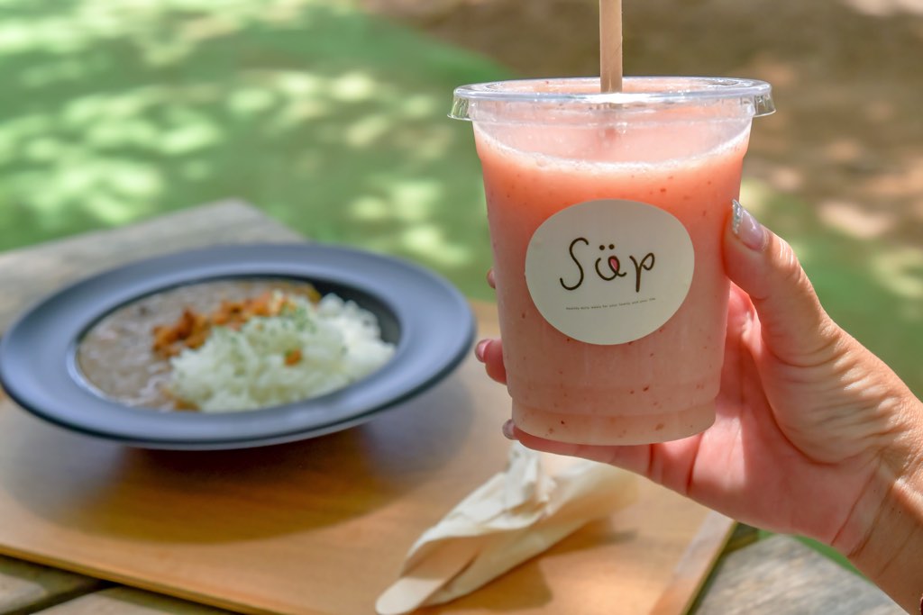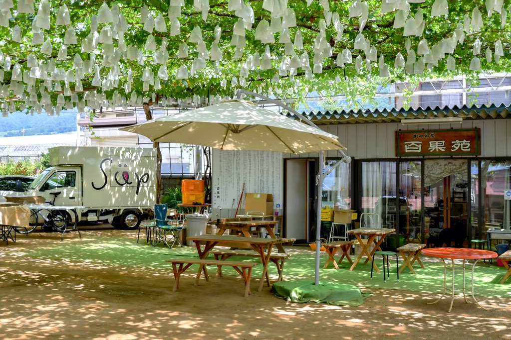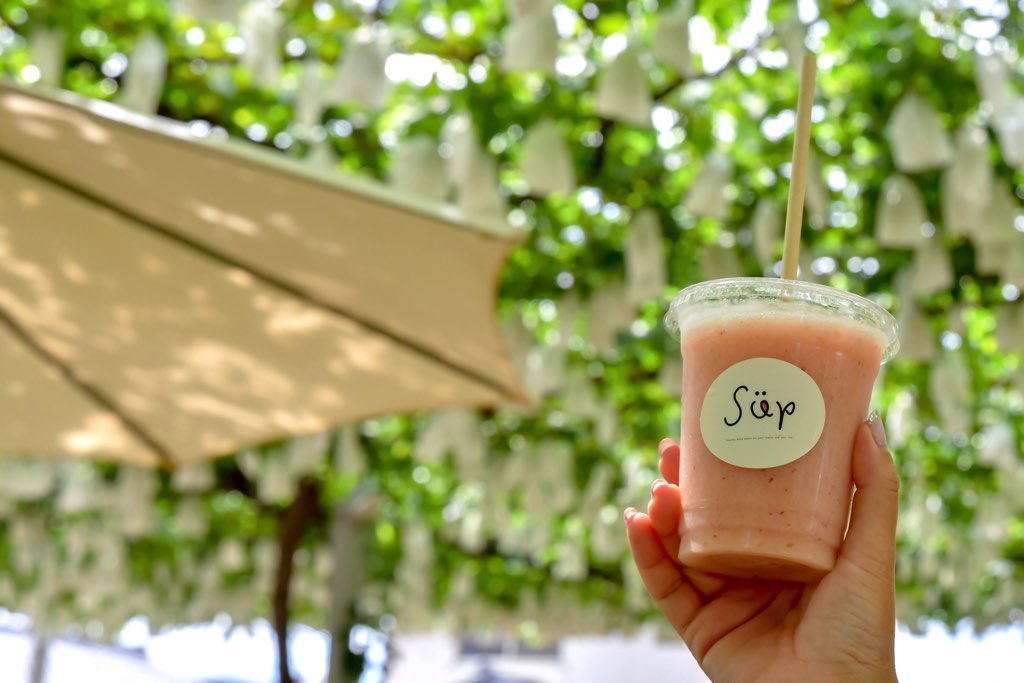 そんな百果苑内の葡萄棚の下で、軽食やスムージーが楽しめるカフェ「Sop(ソップ)」が夏季限定でオープン!