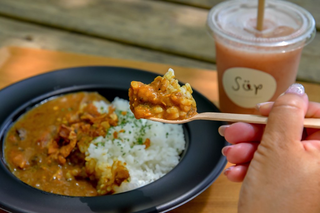 廃棄果物や野菜の状況によりメニューは変わるが、取材日には桃のスムージーとスパイスカレーがラインナップ。