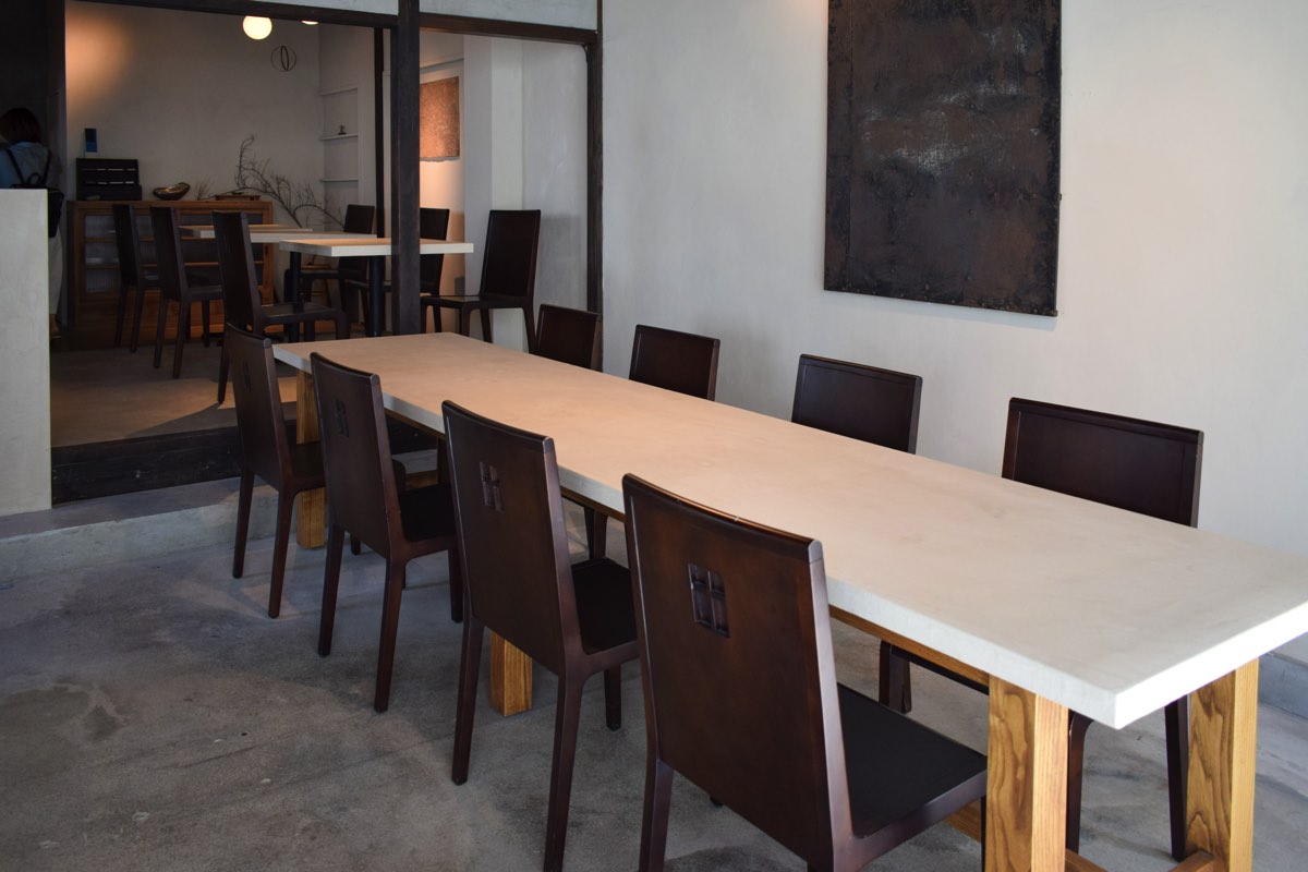 壁や床を自らで丁寧に仕上げたという店内は、シンプルでありながら光と影が織りなす空間美がモダンな雰囲気を創り出す。時間の移ろいと共に変化する陰影が、パフェ同様に何ともドラマティックだ。