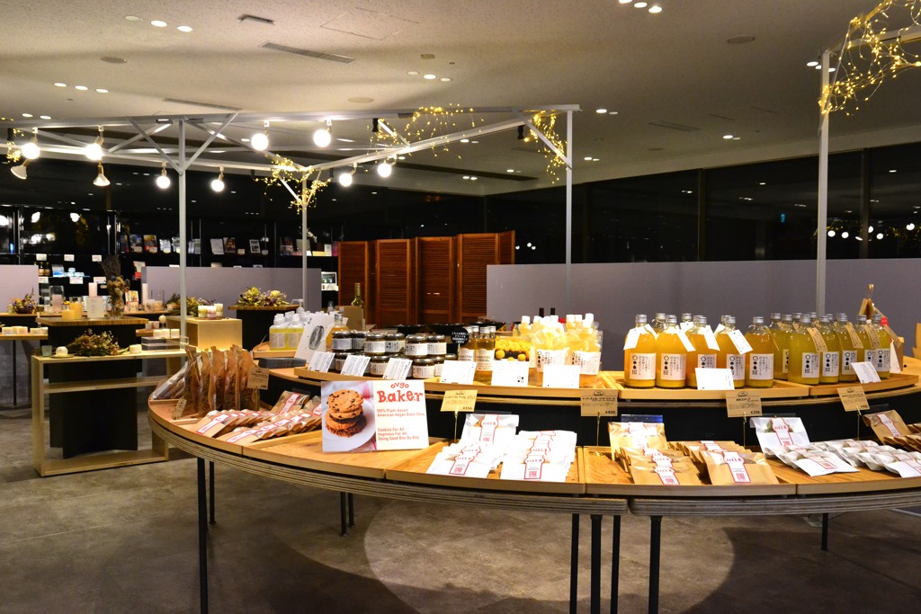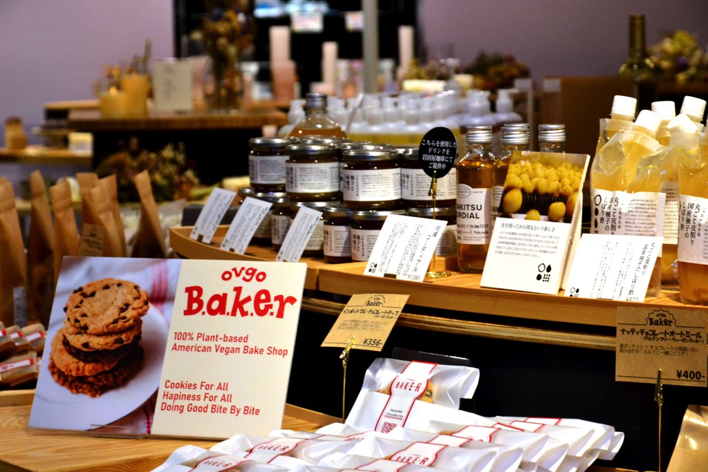 首都圏を中心にアメリカンヴィーガンクッキーで話題の「ovgo B.A.K.E.R(オブゴベーカー)」や、松山油脂が徳島県佐那河内村につくった山神果樹薬草園の柚子やすだちを使った精油やジュース、ジャムなど、こだわりの逸品がズラリと並ぶ。