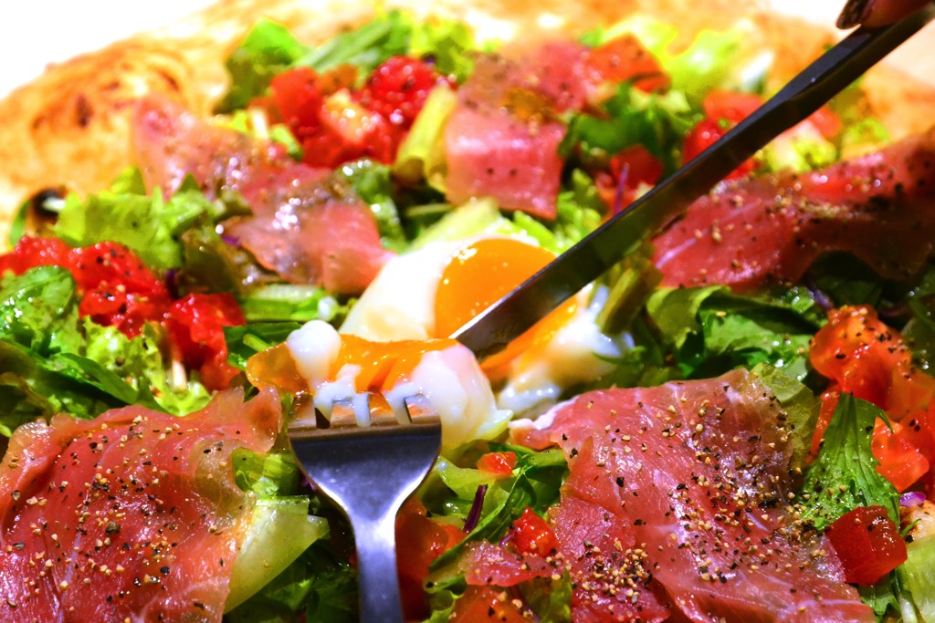 こちらはオリーブオイルにハーブソルト、ちょい生クリームというシンプルな味付け。温玉をとろ~りと崩しながらいただけば、これがまた生ハムの塩味をまろやかに包み込み、ソースのように絡めて楽しめちゃう。