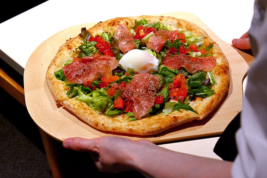 石窯をこのために購入し、自ら師匠の下で特訓を受け、空中で何度も生地を回し、発酵の状況に寄り添い、冷蔵庫の温度設定まで見直し、試行錯誤を重ねた結果、やっと納得のいくピッツァが完成したという。