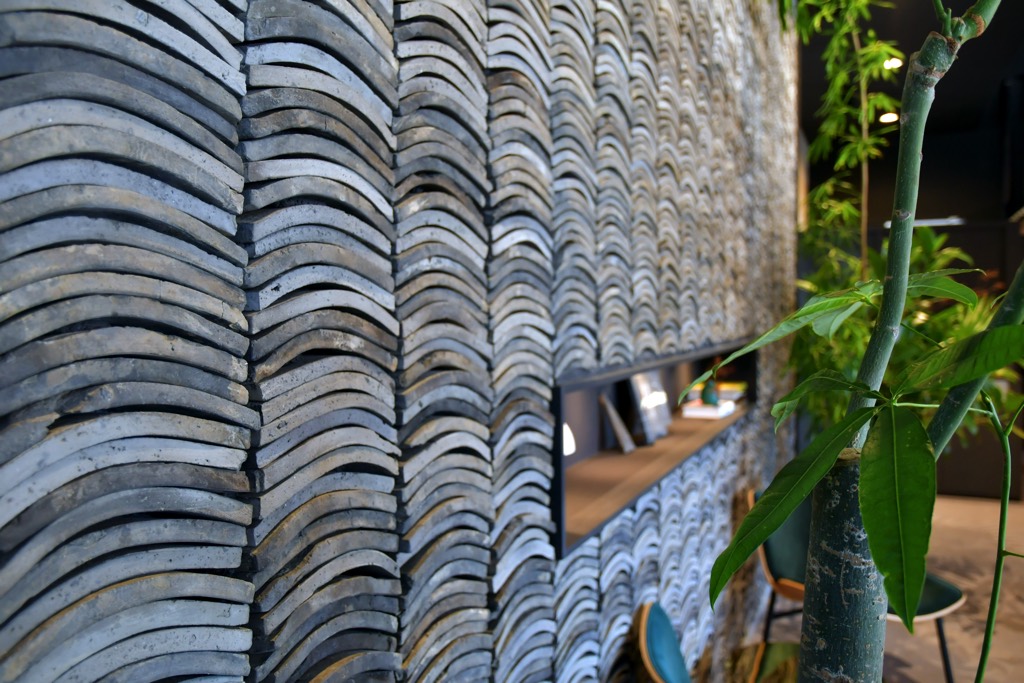 そう、この壁にぎっしりと敷詰められた“瓦”は、古民家で実際に使われていたものをカットし積み重ねていて、その数なんと3500枚!