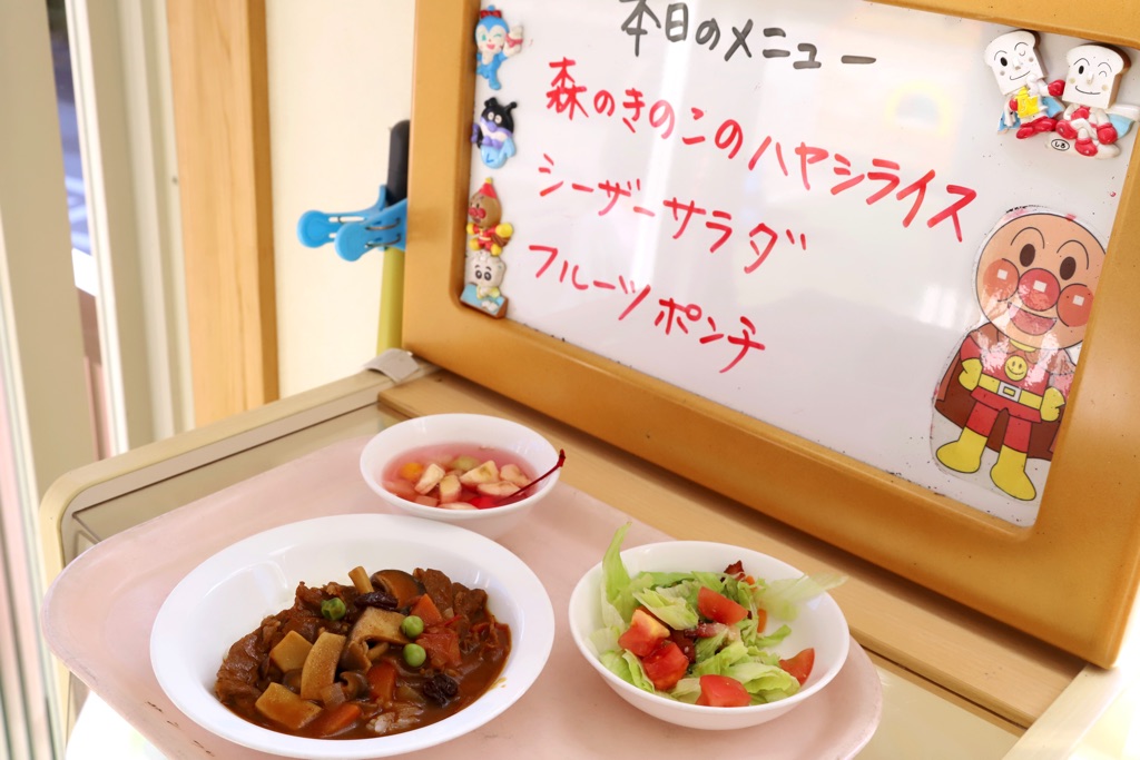予約すれば700円で在園児と同じ給食を食べることも(平日2組限定。アレルギーのない親子対象)。この日はハヤシライス♪安心安全、美味しい給食にママもほっこり。