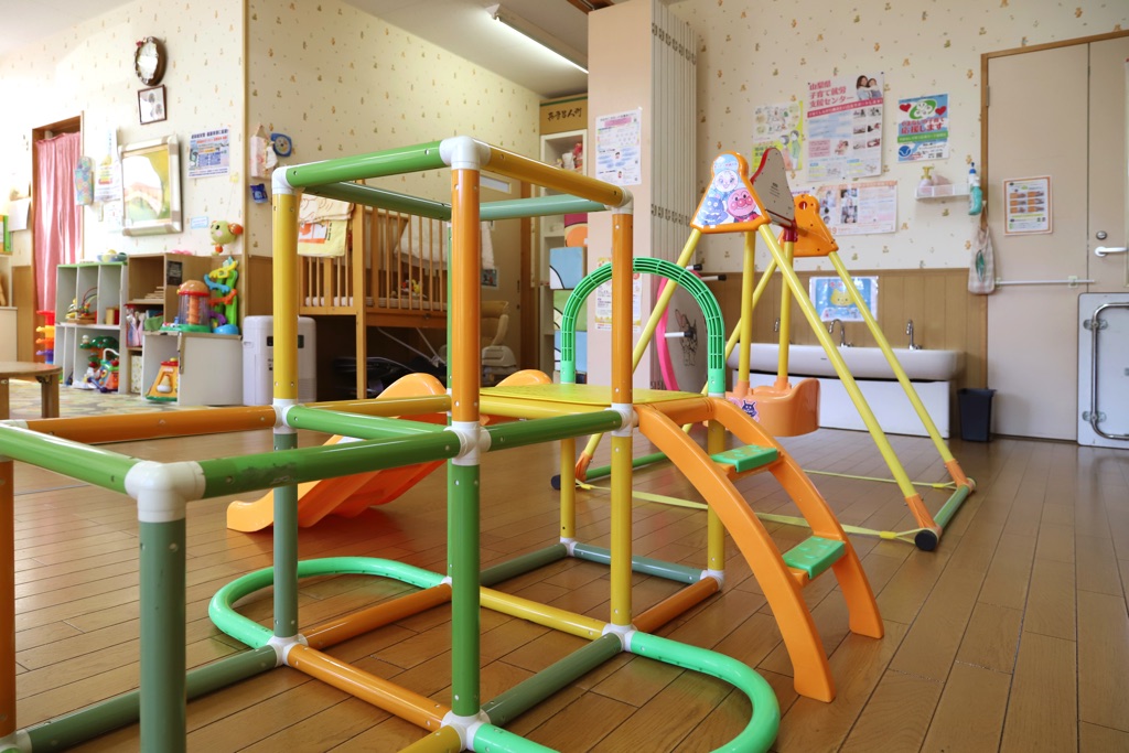最近では主に1歳児さんが多いというあんぱんくらぶ。広い部屋の中にはジャングルジム&滑り台やブランコなどもあって、やんちゃな男の子でも満足できそう。