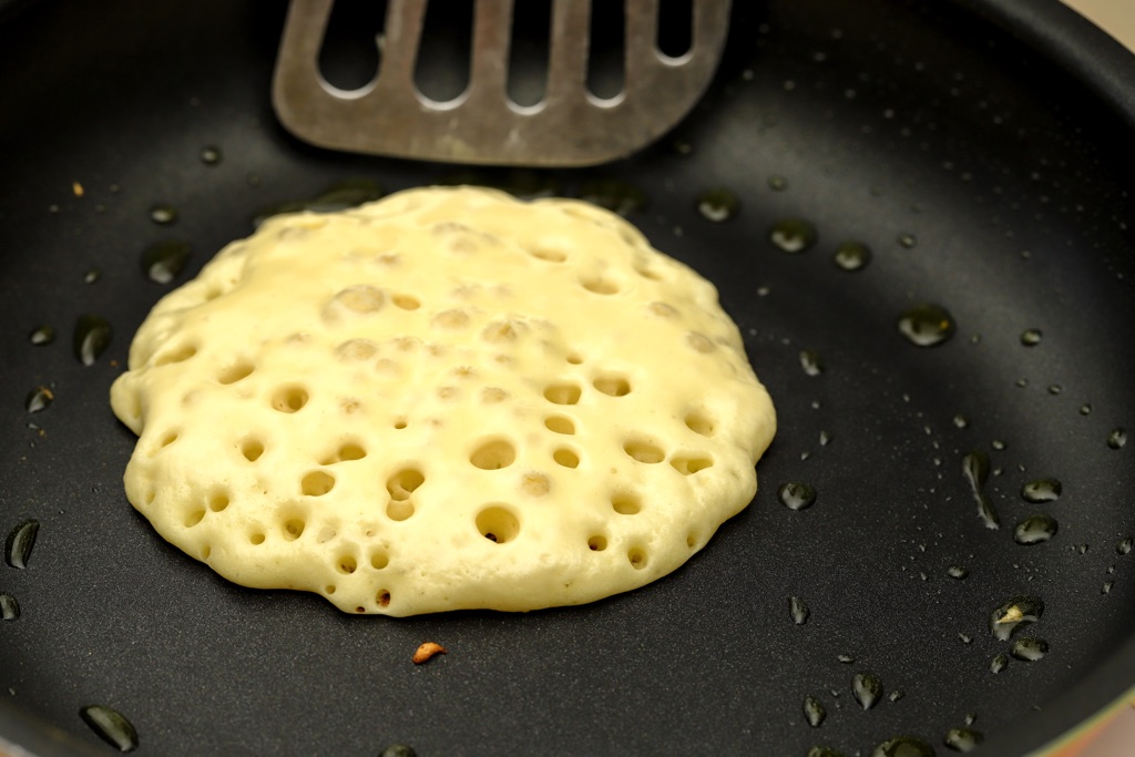 フライパンにオリーブオイルを敷き、生地を丸く流し蓋をして3分焼く。ぶつぶつができてきたらひっくり返して蓋をする。