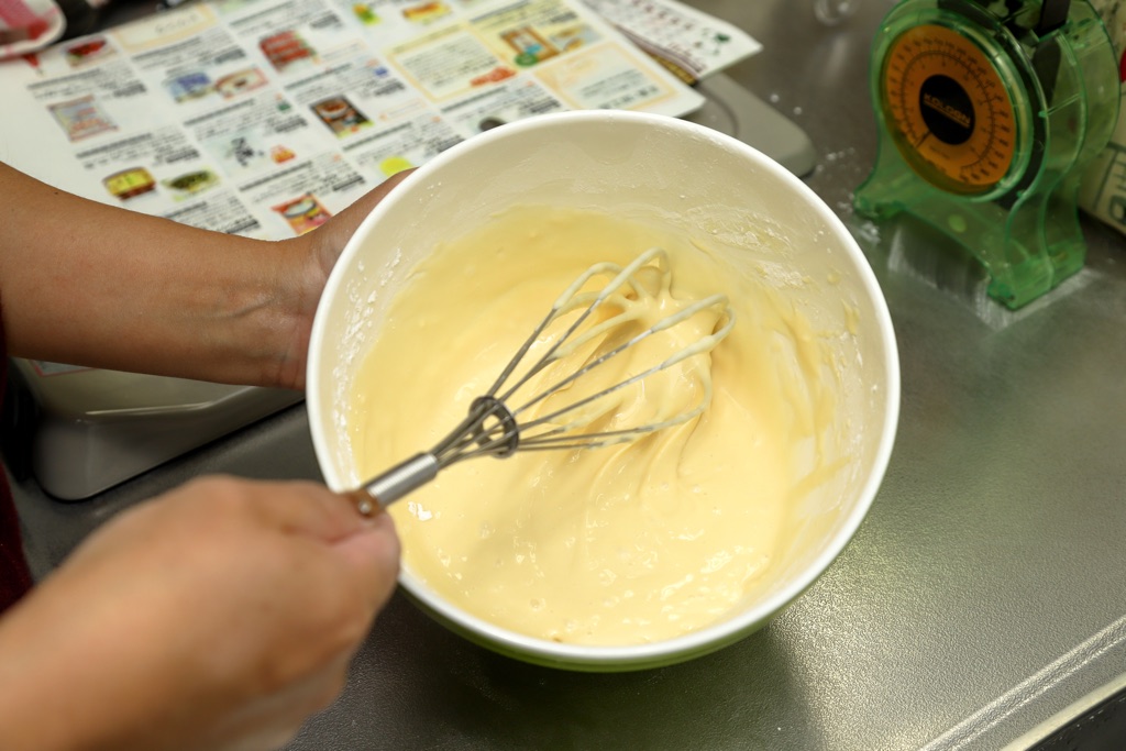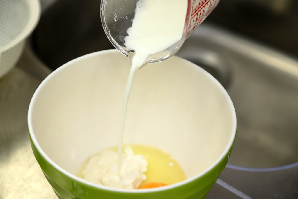 ①にパンケーキミックスを加え、粉っぽさがなくなるまで混ぜ合わせる。