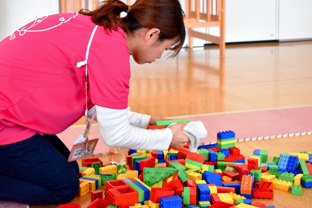 にら★ちびでは、みんなでお片づけをする時間を1日4回設定。音楽が流れたら、スタッフさんも参加して一斉におそうじスタート!