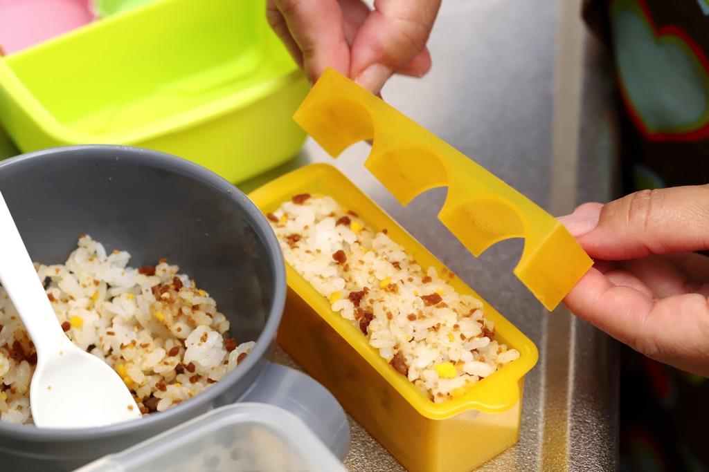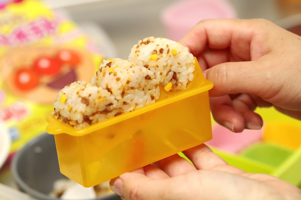ミニ俵むすびを作る。ふりかけなどを混ぜ込むと味が付いて食べやすくなるので、おすすめ。100均などのグッズを使えば簡単!