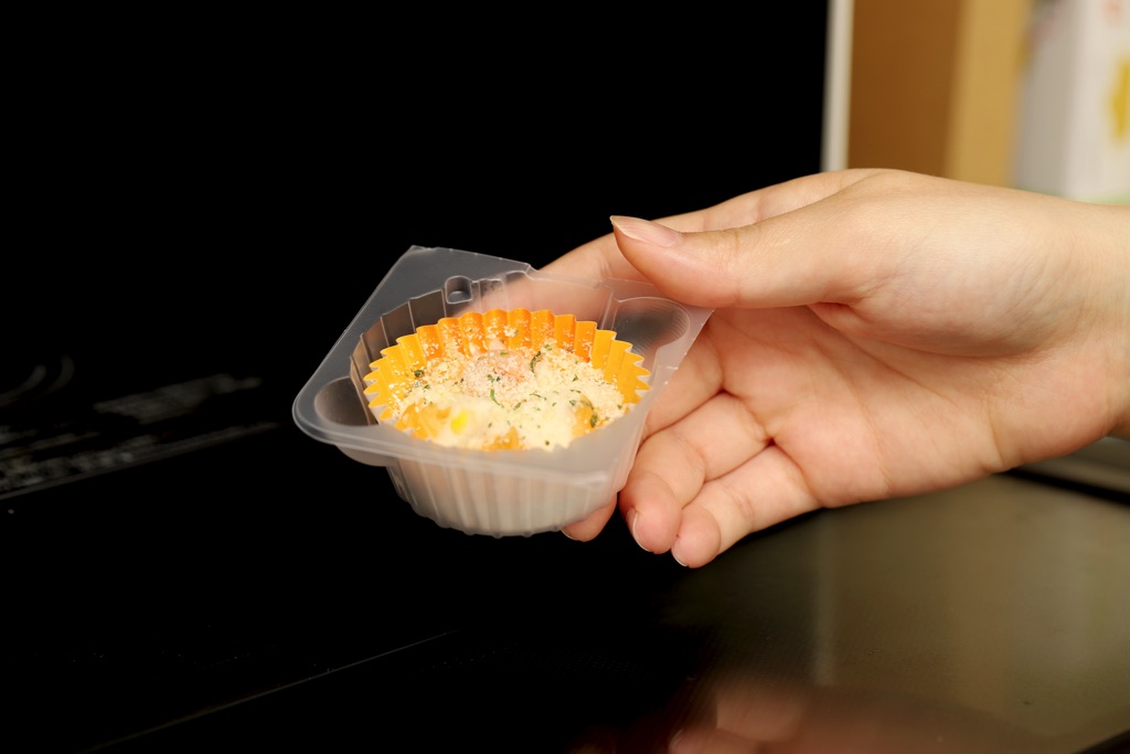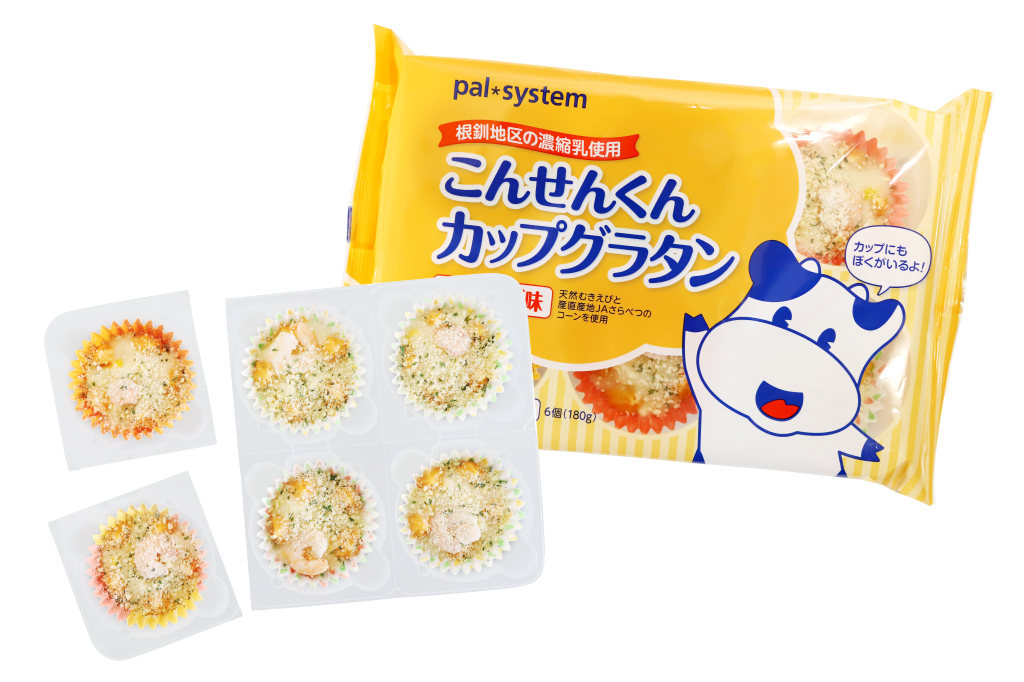 北海道産の濃縮乳でクリーミーなグラタンに仕上げた。産直コーンと天然むきえび使用で、ひとつずつ簡単に切り取れ、レンジでチンするだけ。カップごとお弁当に入れられる小さめの食べきりサイズが◎!