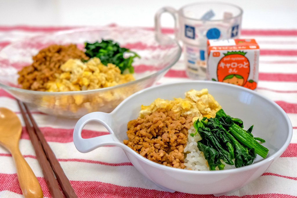 子どもは卵やひき肉をちょっと甘めに味つけすると好きです。余裕があれば、挽肉はニンニクや生姜を加えて炒め煮すると美味しさアップ!