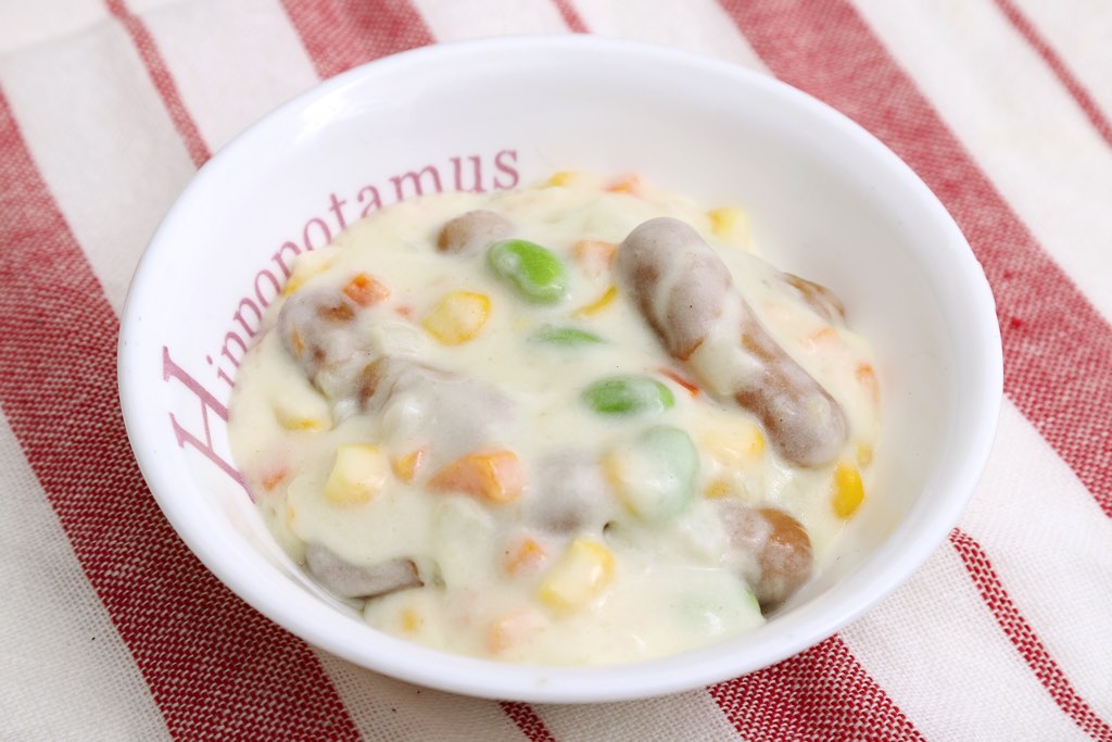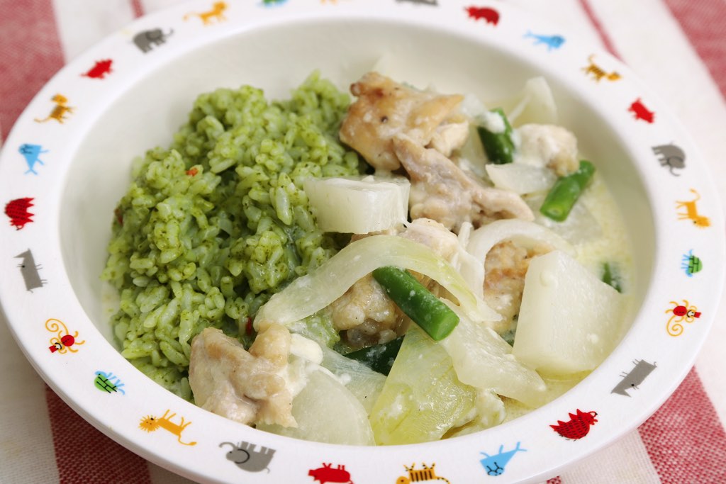 - ②①にいんげん、大根を加え5分煮て、さらに牛乳を加え、ふつふつと煮立つ直前まで煮る。