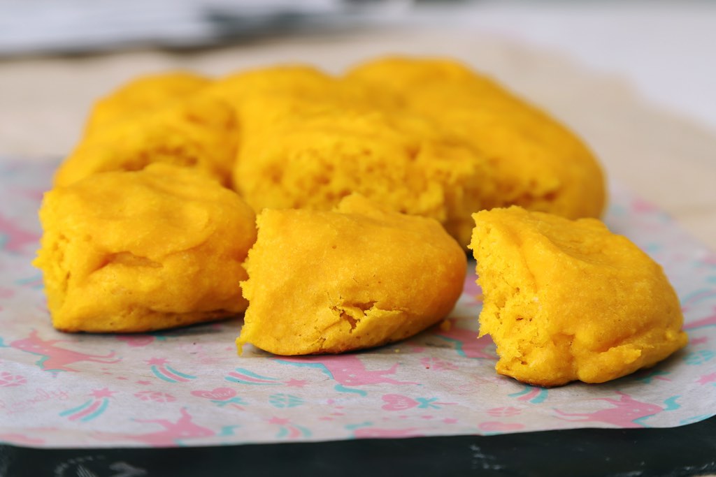 - ①うらごしかぼちゃはラップをせずに1分レンジ(600w)で加熱し、牛乳を加えてよく混ぜる。