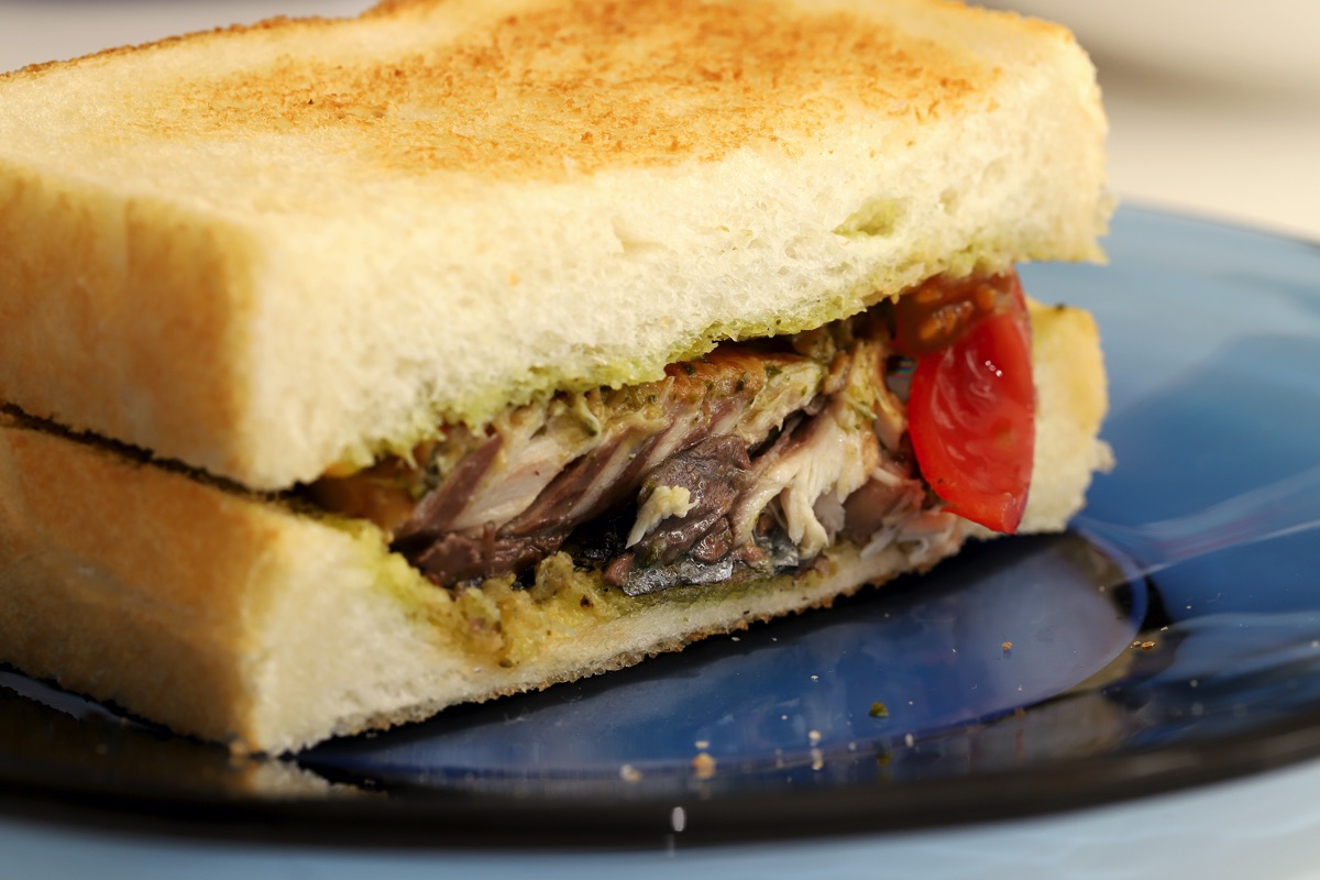 解凍したさばを水けをふいて焼く。トーストしたパンに解凍したジェノベーゼソースを塗り、サバを挟む。