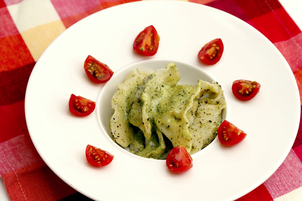 フライパンで、ボイルしたジェノベーゼソースと生クリームを弱火で温め、ゆでた水餃子と絡める。