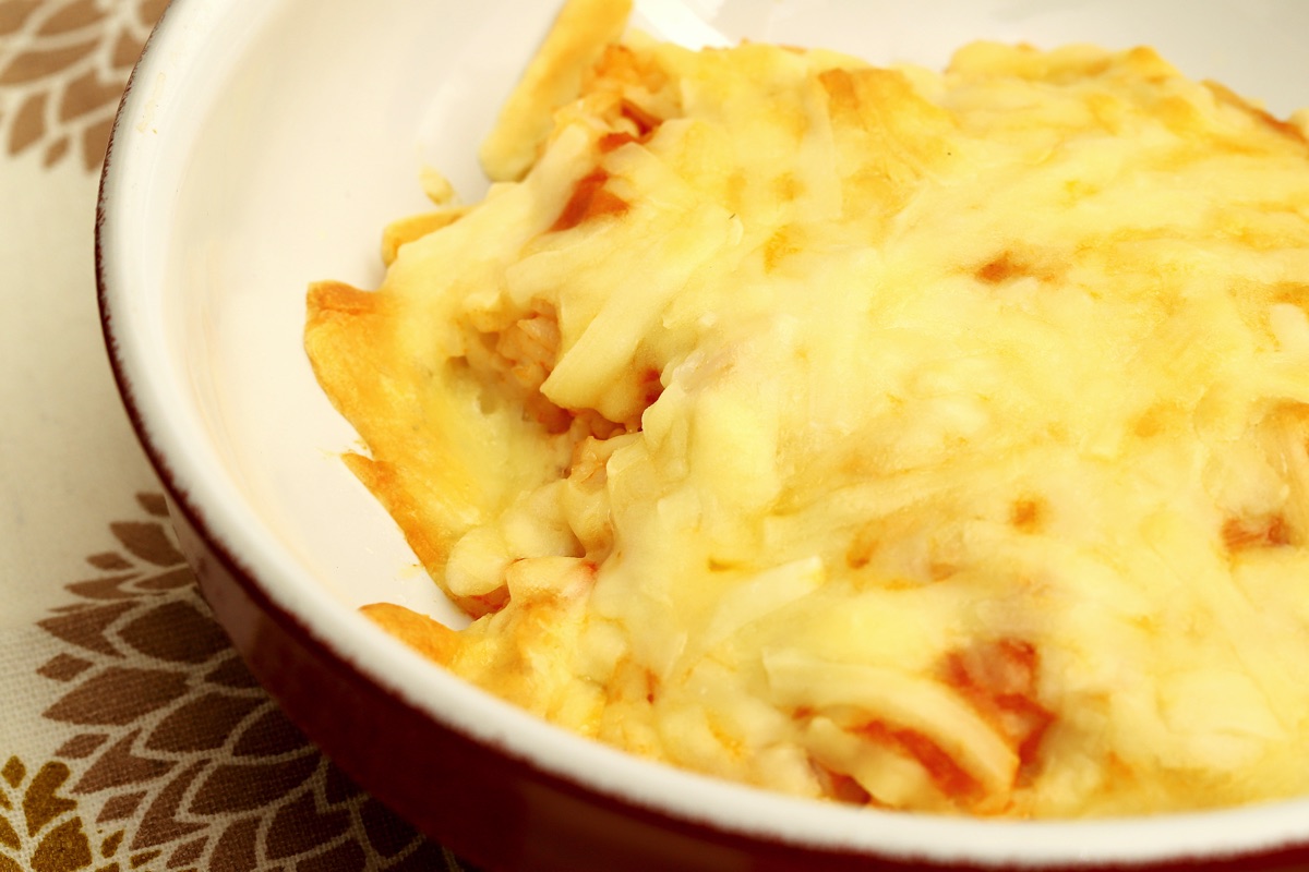 残りのソースをかけて、ピザ用チーズをのせたら、220度のオーブンで10分ほど焼く。