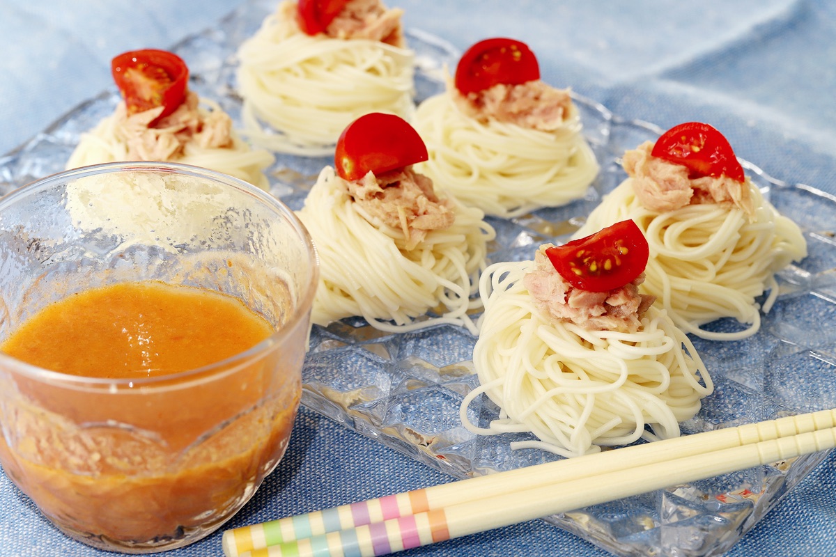 ★を混ぜて、つけ汁にする。ゆでたそうめんを器に盛り、ツナやミニトマトを飾る。
