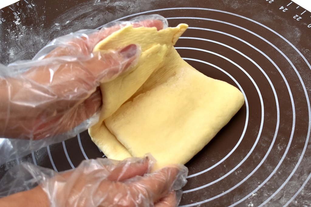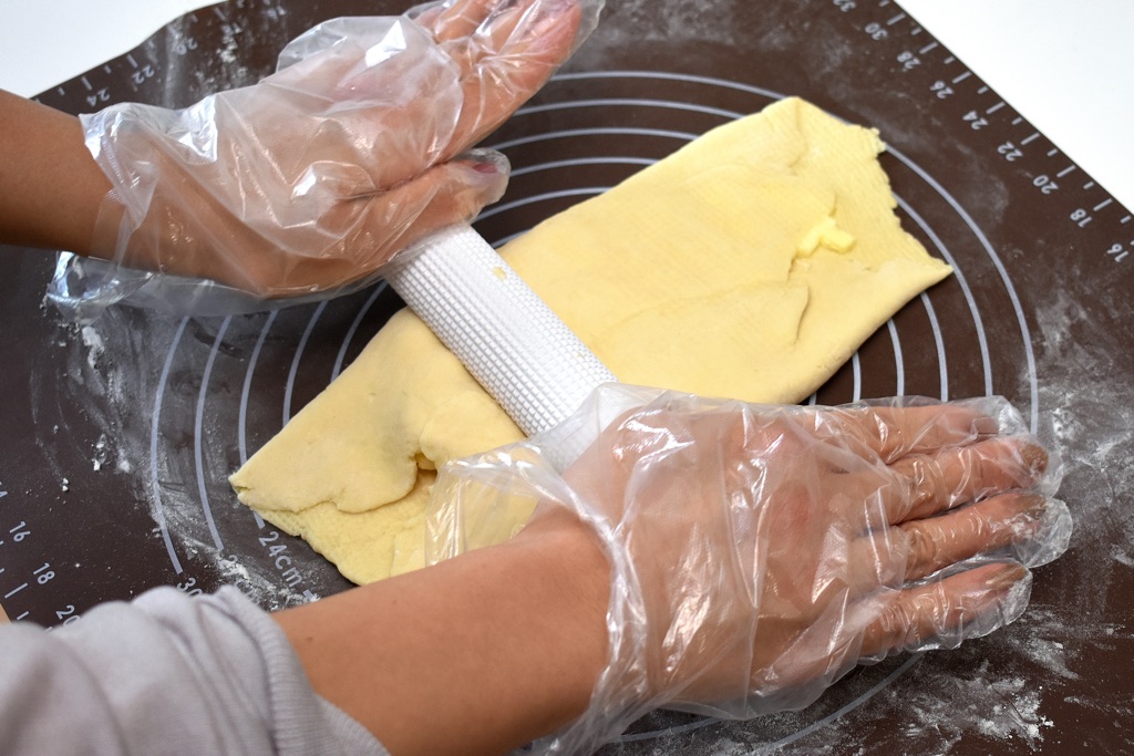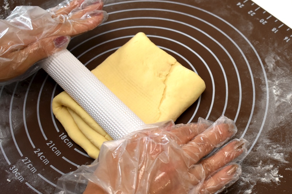 ④生地を90度回転して、横長の左右の記事を均等に折り重ね、めん棒で厚さ1cmになるように縦長に伸ばす。これを6回繰り返したら、ラップで包み1時間冷蔵庫で寝かせる。