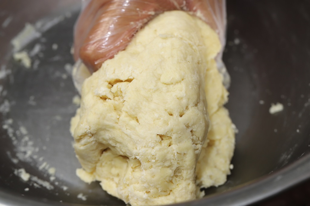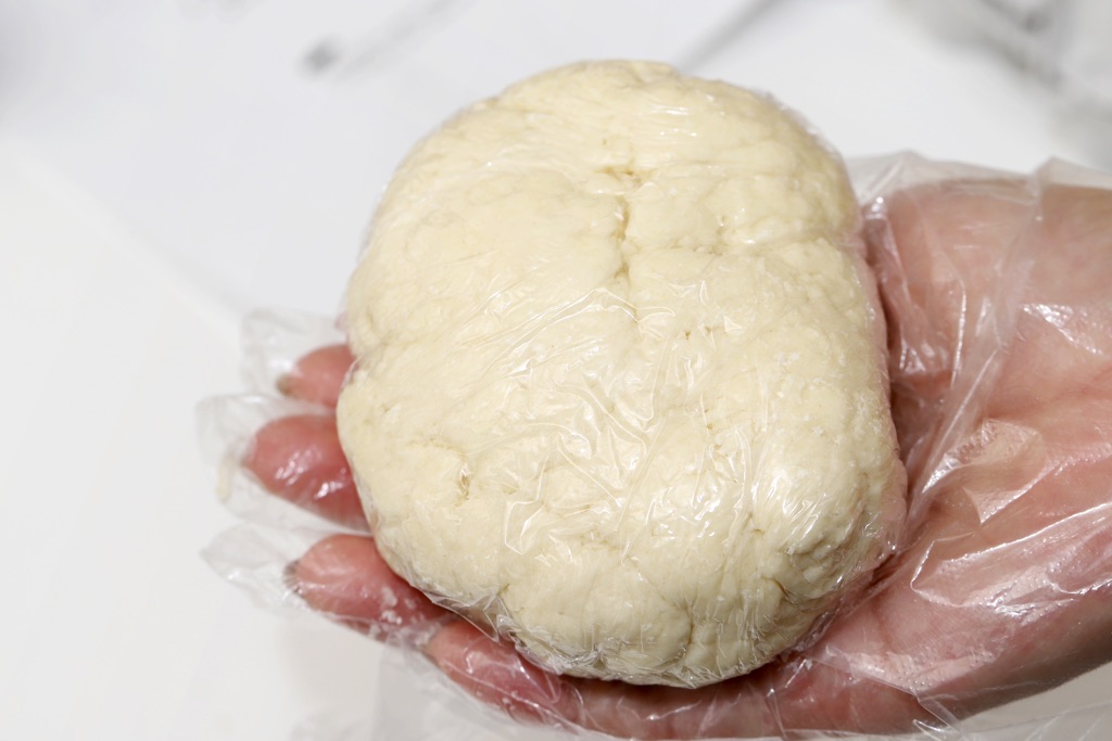 ①ホットケーキミックスに水を加えよく混ぜひとまとめにしてラップに包み、1時間冷蔵庫で寝かせる。バターは5mm角に切り、冷蔵庫に入れておく。