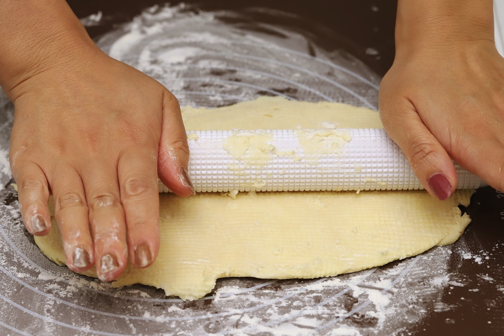②打ち古粉をふって①の記事を25㎝×25㎝の正方形にめん棒でのばす。