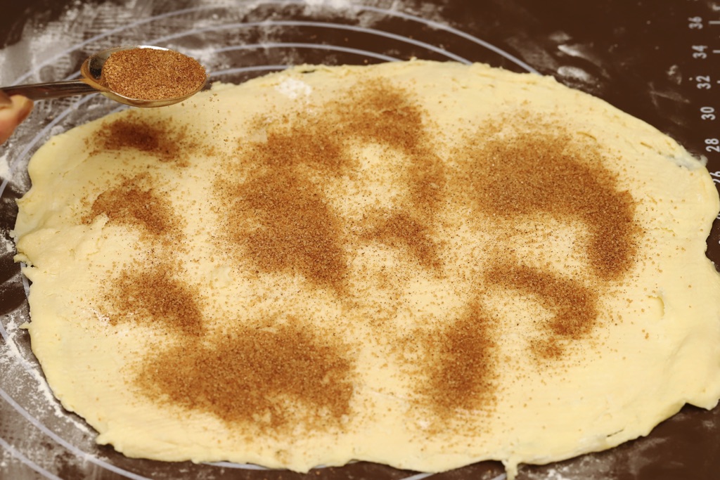④の生地を幅25㎝長さ30センチほどにめん棒で広げ、シナモンと砂糖をふる。