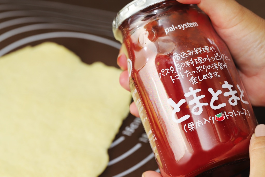 ②2~3等分に生地を分け、めん棒で食べやすい大きさにのばし、トマトソースを塗る。