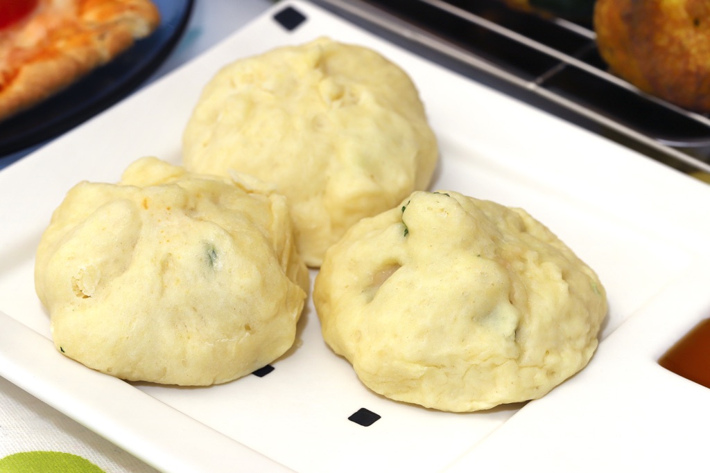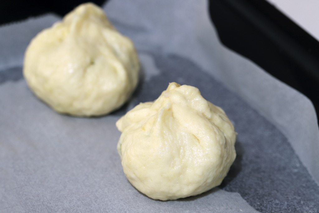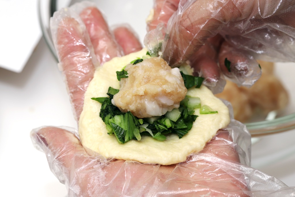 ③生地を厚さ1㎝ほどに丸く広げ、①の鶏だんごとチンゲン菜を包む。上をつまんで、生地同士をくっつける。