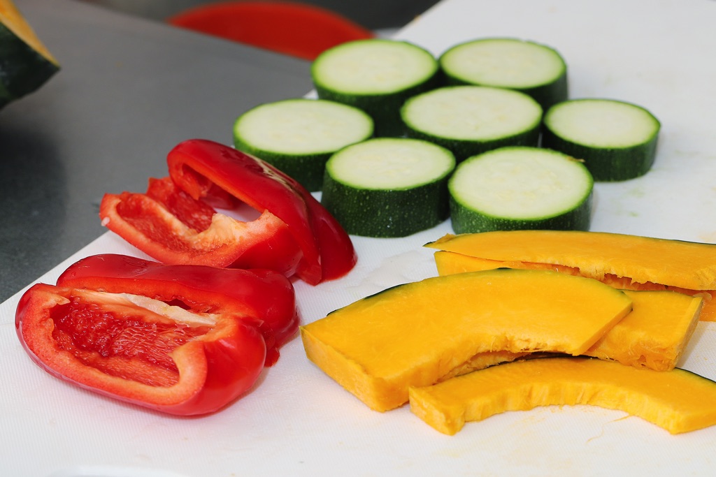 ①かぼちゃはくし形の薄切り、ズッキーニは輪切り、カラーピーマンは縦に4等分する。
