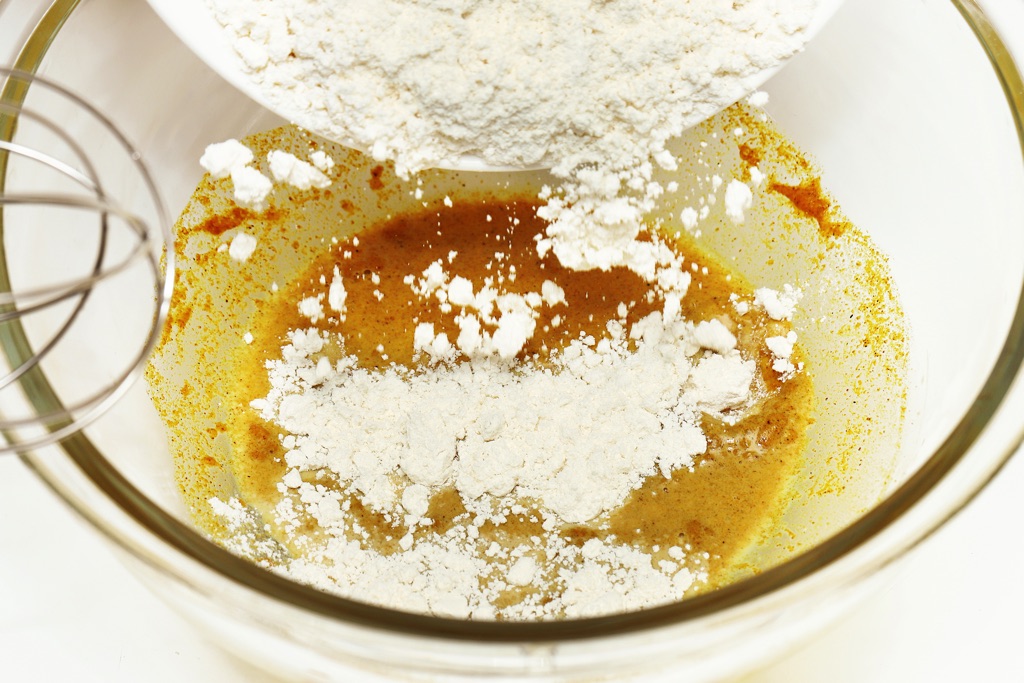 ②ホットケーキミックス、牛乳、カレー粉、塩を混ぜて衣を作る。