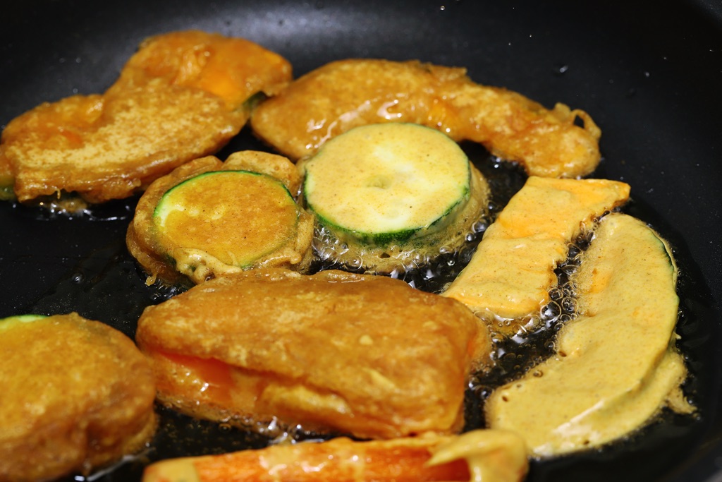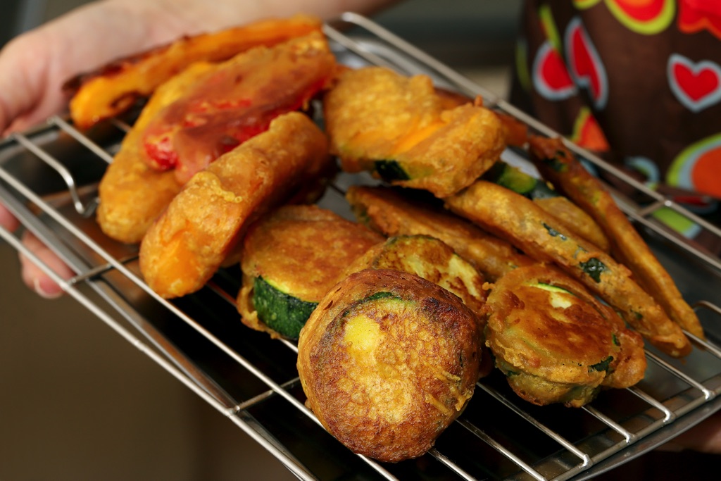 ③野菜に衣をつけて揚げる。油をきってバットにとる。
