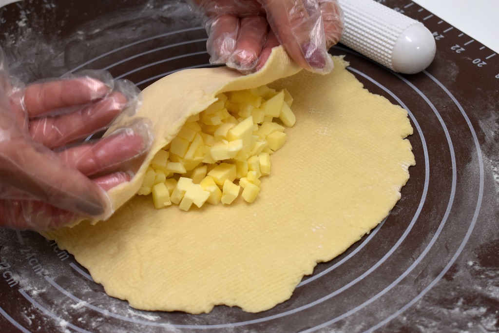 ③中央にバターをのせ、左右を折り重ねて幅10cm×長さ30cmほどにし、めん棒で厚さ1センチくらいにのばす。
