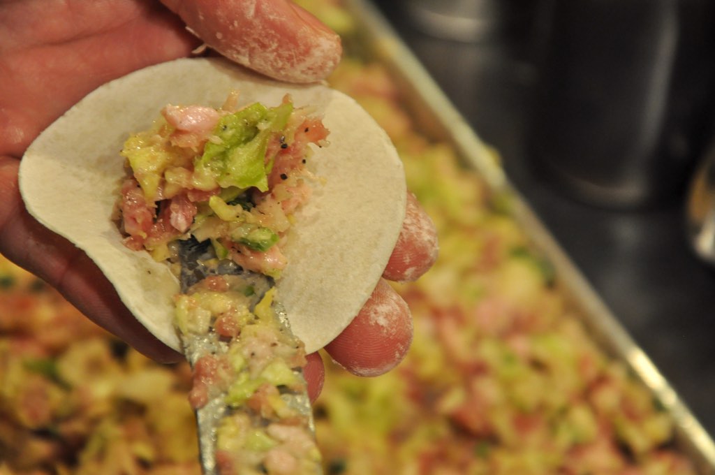 こちらは、小ぶりで半揚げのサクパリ感がやみつき者続出の大人気メニュー。注文をうけてから、オリジナルの薄皮に手際よくタネを包んでいく。