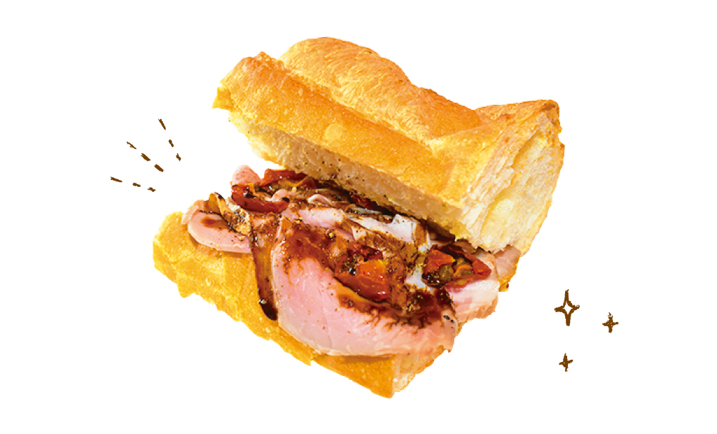 バンズからすべてお店で手作りしているというこだわりのサンドイッチ。しっとりやわらかいサラダチキンとオリジナルのたまごのフィリングをもっちりした食感のパンに挟み、サンドイッチとしての完成度をあげる。ブラッスリーならではのローストポークはセミドライトマトとソースで旨味をアップ!