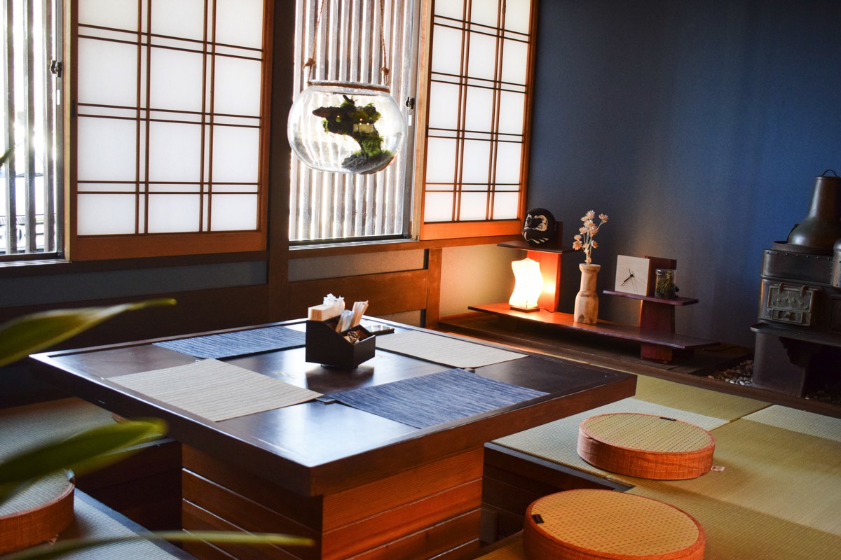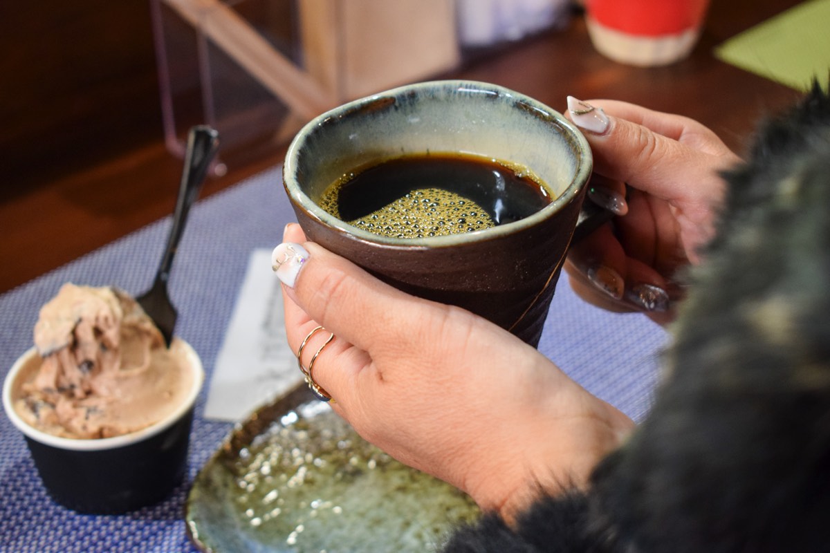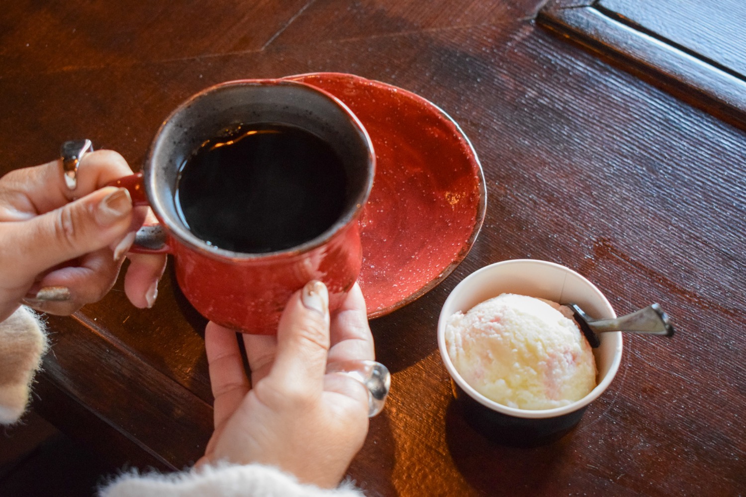 囲炉裏や釜戸を生かした風情ある店内にはカウンター席とお座敷があり、くつろぎの空間で美味しいジェラートとこだわりのコーヒーをいただける。
