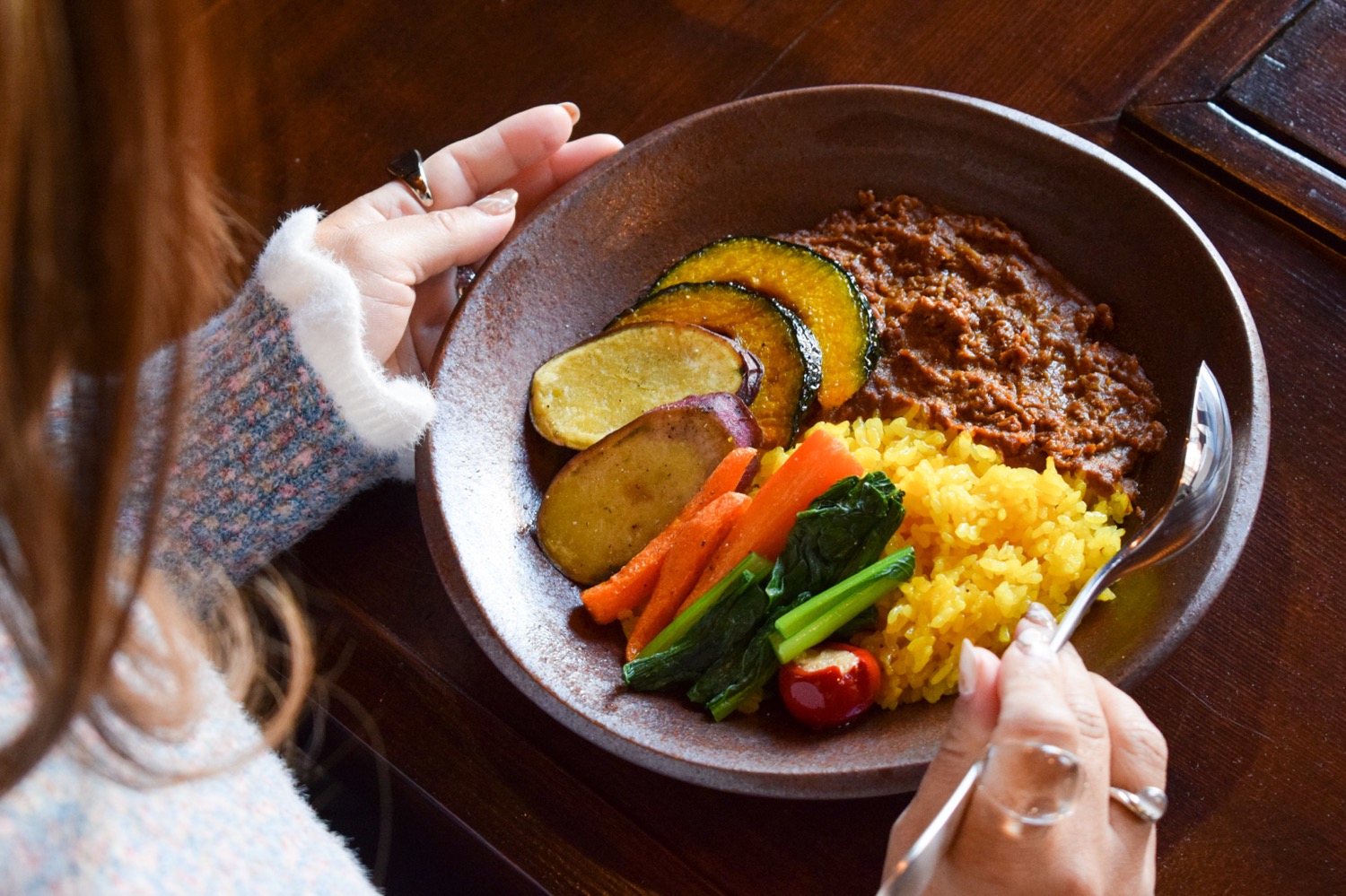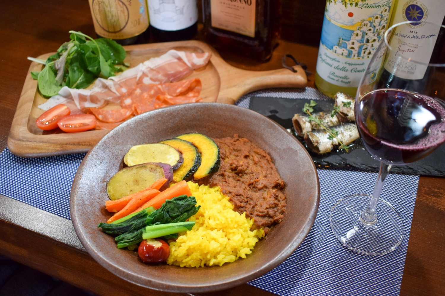 料理人経験も豊富な店主・関さんが腕をふるうカレーは、“ジェラートに合う”スパイスから作る鶏ひき肉のキーマカレー!山梨県産の天空かぼちゃやシルクスイート、にんじんなど、彩り豊かな野菜を素揚げし、野菜本来の持つ甘みを引き出す。
