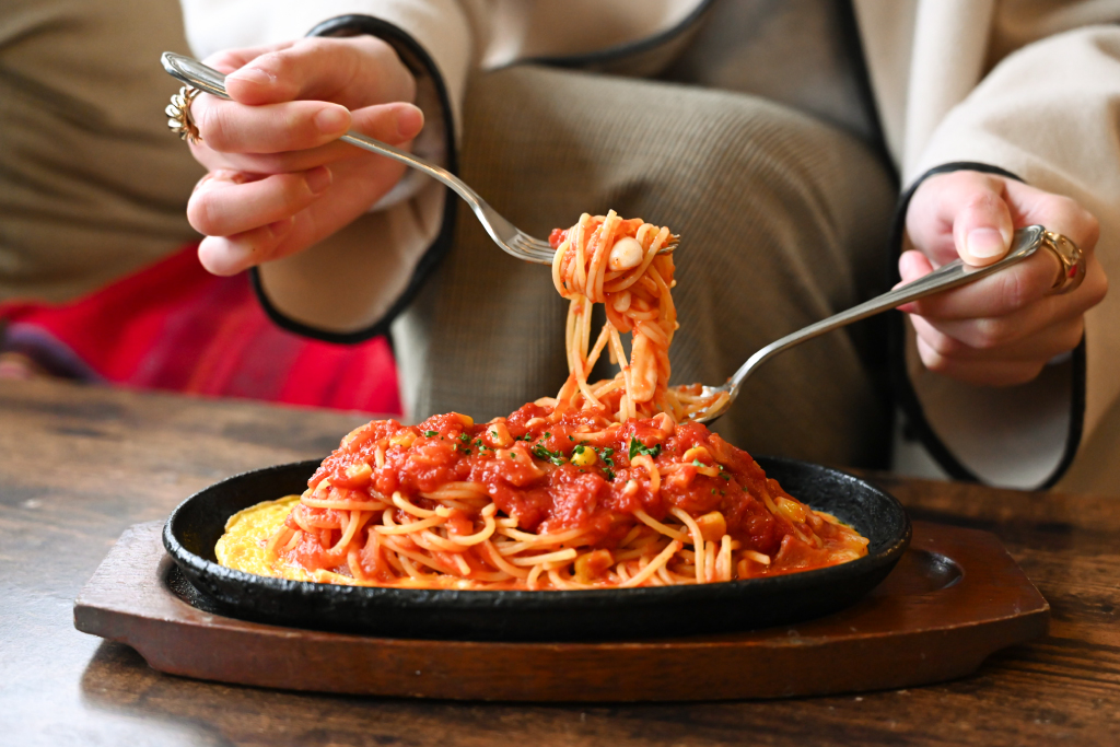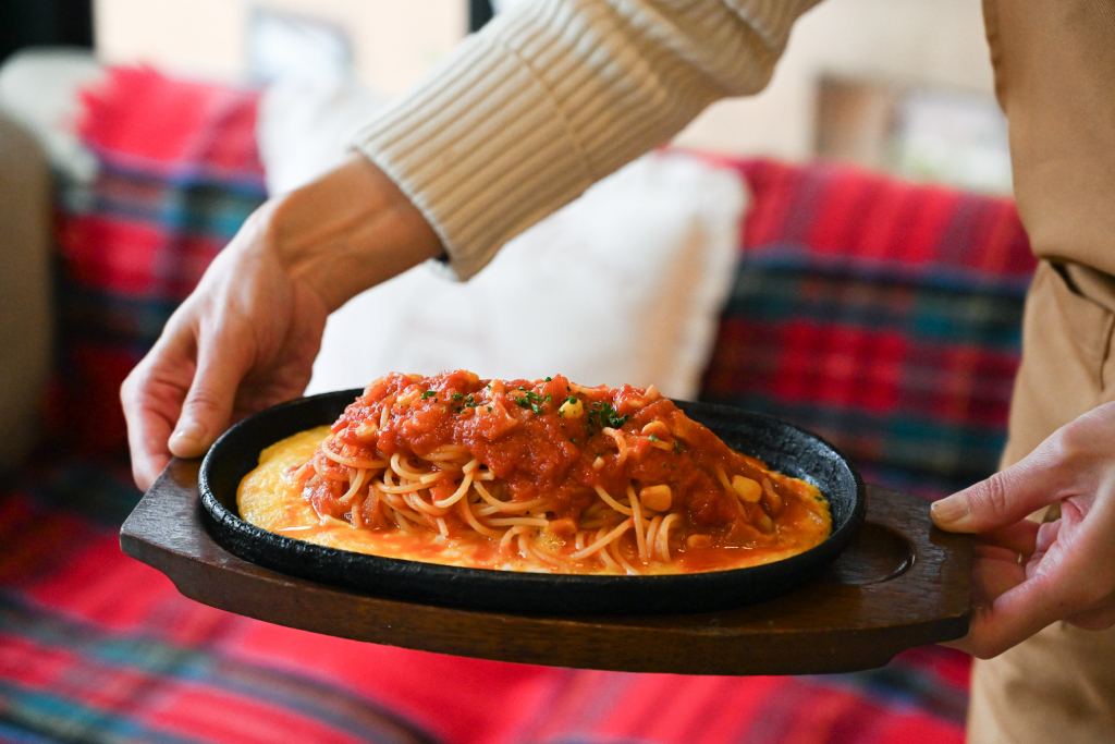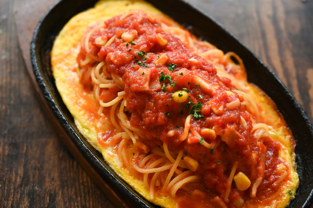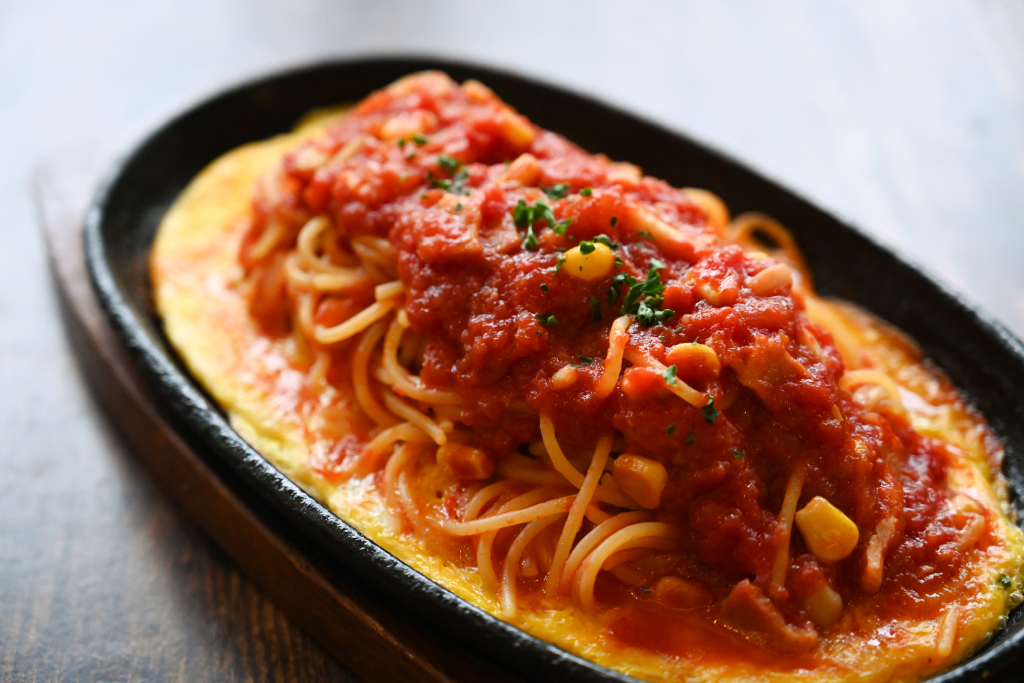 昔からの作り方と味わいをそのままに、甘めのトマトソースに温めておいた鉄板の上にたっぷりの溶きたまごをかけ、固まり切る前にスパゲティを盛る。コーンやベーコンなど色とりどりの具材を入れたソースをたっぷりとかけたら、鉄板の冷めないうちにテーブルへ。