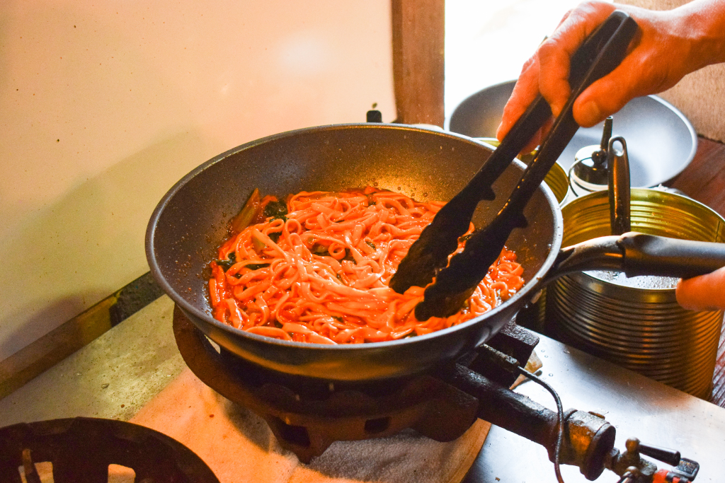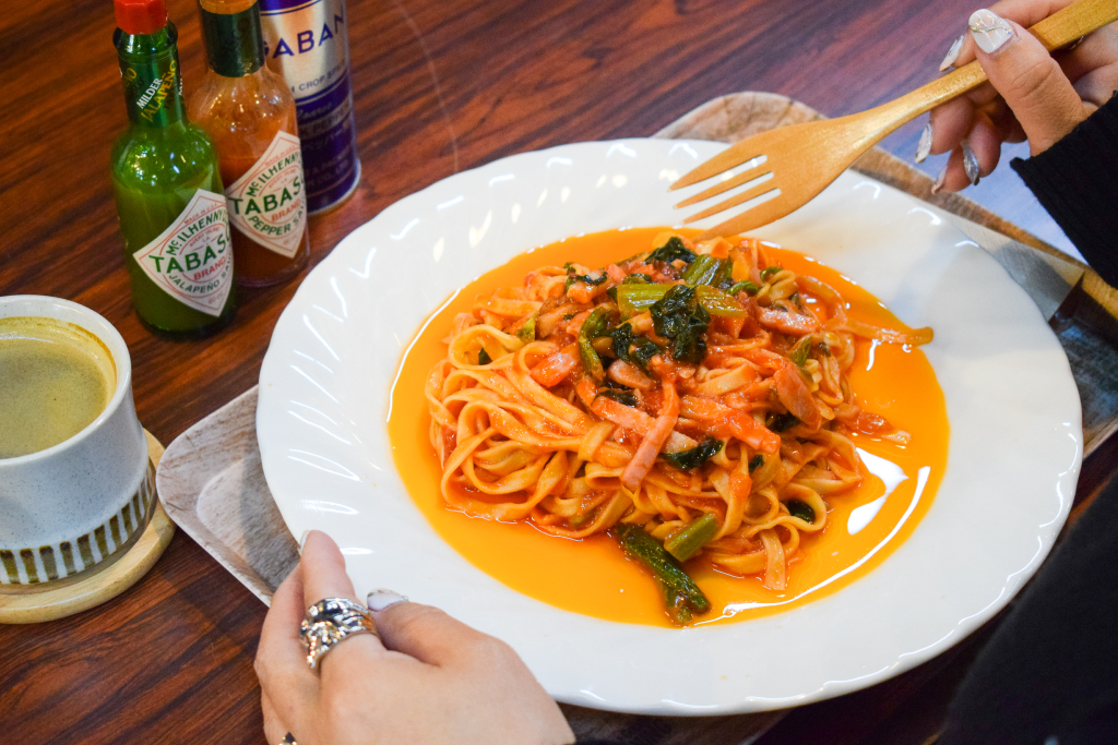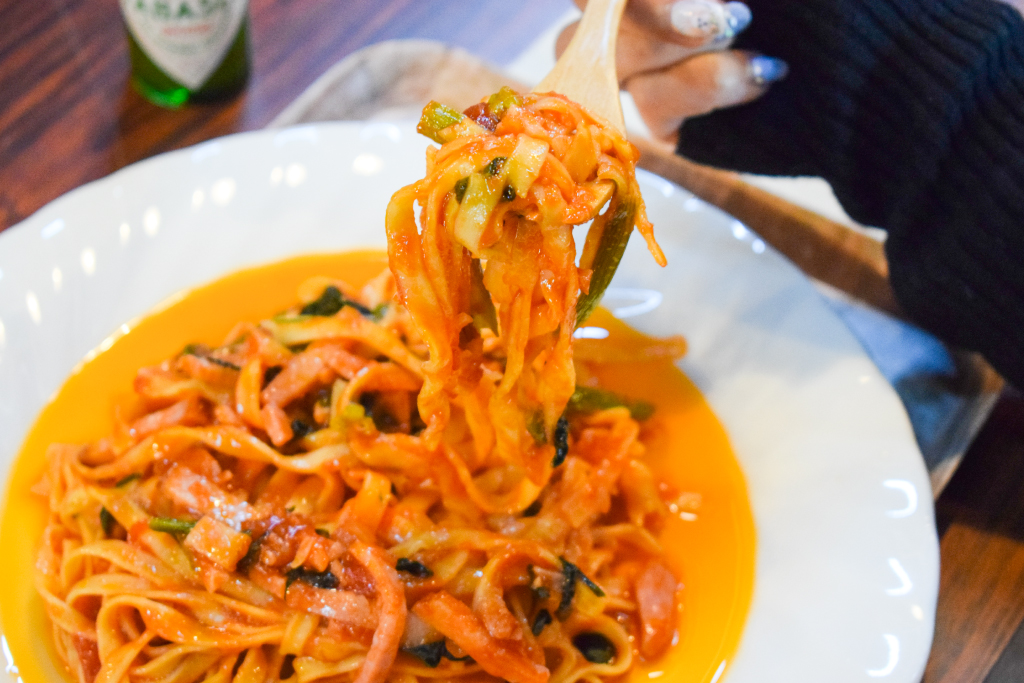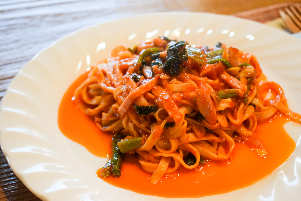 スパゲッティはすべて自家製の生パスタを使用。生パスタのナポリタンはなかなか難しいが、ソースが麺によく絡むのでどうしてもこれで作りたかったのだという。玉ねぎはゆっくりソテーし、オーブンに入れてからソースの中に混ぜ込み、生トマトと水煮のトマトをミックスして、酸味とコクを出す。そんな手間暇かけて作った自家製トマトソースが、もちもちの自家製生パスタによく絡み、オリジナルナポリタンの味を完成させる。